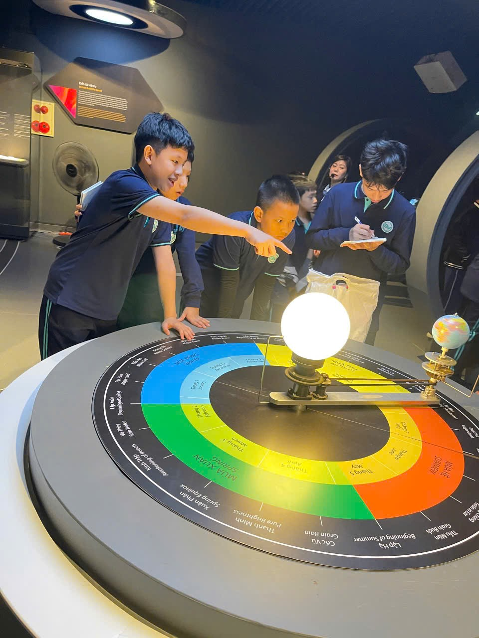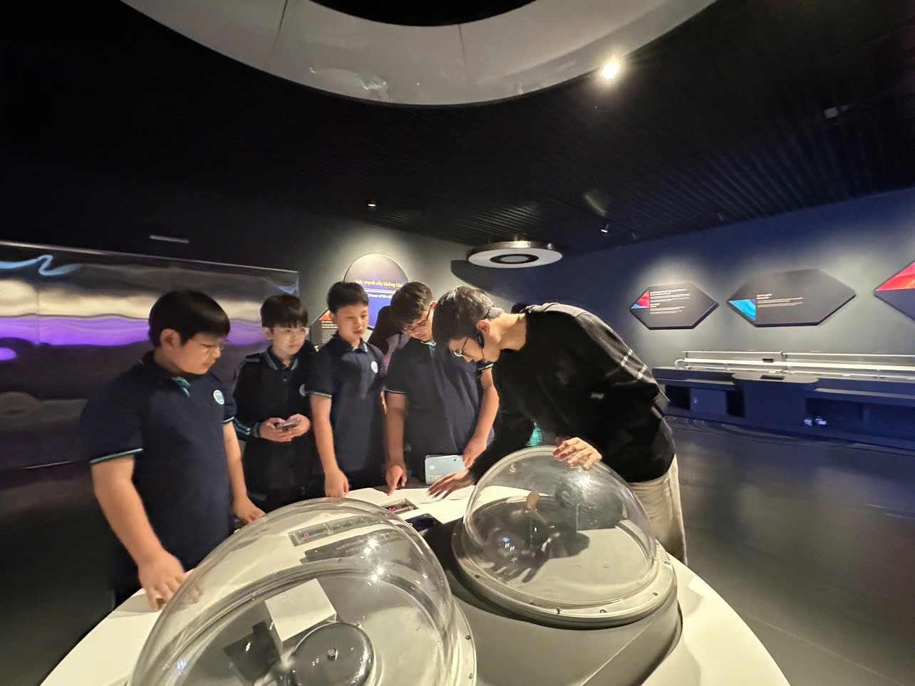 Tiếp nối hành trình, các bạn 6A1 đến với Trung tâm Vũ trụ Việt Nam, nơi chứa đựng niềm tự hào về khoa học công nghệ nước nhà. Tại đây, các con được quan sát mô hình vệ tinh, hình ảnh Trái Đất từ không gian, tìm hiểu về công nghệ vũ trụ và nghiên cứu không gian. Bài học về chuyển động tự quay của Trái Đất trở nên trực quan và đầy hứng thú, khơi dậy trong các em niềm say mê với khoa học và khám phá vũ trụ. “Em ấn tượng nhất là khi được xem hình ảnh Trái Đất từ vệ tinh. Em nhận ra rằng hành tinh của chúng ta thật đẹp và mong mọi người cùng bảo vệ môi trường để Trái Đất luôn xanh.”- Đức Anh, học sinh lớp 6A1, bày tỏ cảm xúc.