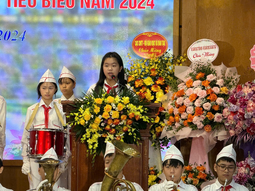 Trong lời phát biểu chào mừng, em Lê Thu Linh đã bày tỏ lòng biết ơn sâu sắc của học sinh toàn quận tới các cấp lãnh đạo quận Ba Đình, các thầy cô giáo – những người đã luôn quan tâm, chăm sóc, tận tâm dạy dỗ và đồng hành cùng học sinh trong quá trình học tập, rèn luyện. Đồng thời, em bày tỏ niềm tự hào khi được là học sinh của Quận Ba Đình giàu truyền thống lịch sử, được học tập trong những ngôi trường khang trang, hiện đại, thân thiện, gần gũi .