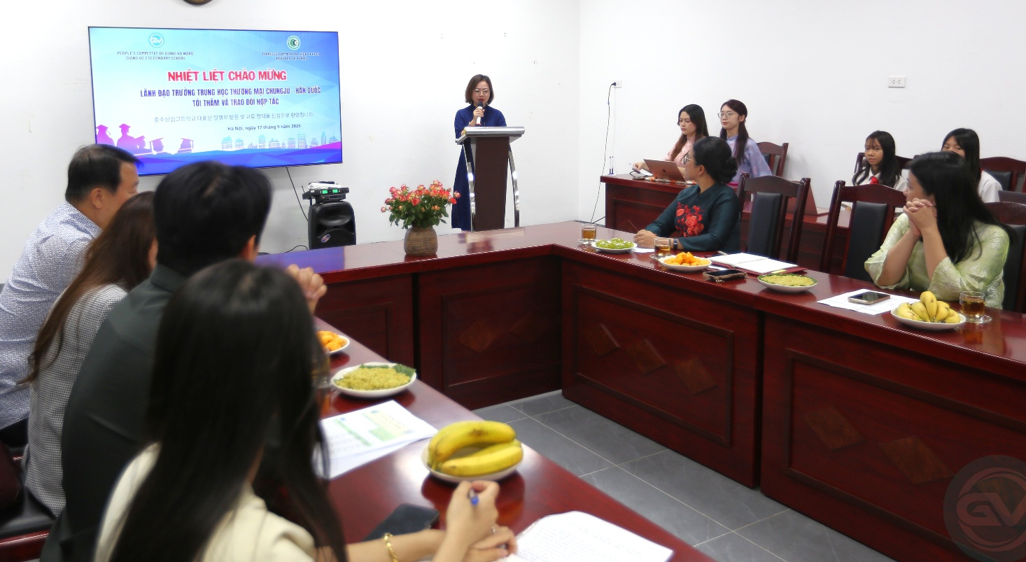 Đại diện nhà trường, cô giáo Phạm Thị Mai Hoa – Phó Hiệu trưởng Trường THCS Giảng Võ 2 - phụ trách công tác Hợp tác quốc tế của nhà trường đã giới thiệu khái quát quá trình xây dựng, phát triển, những thành tựu nổi bật của nhà trường trong công tác giáo dục đặc biệt là hoạt động hợp tác quốc tế, công tác giảng dạy tiếng Hàn Quốc.