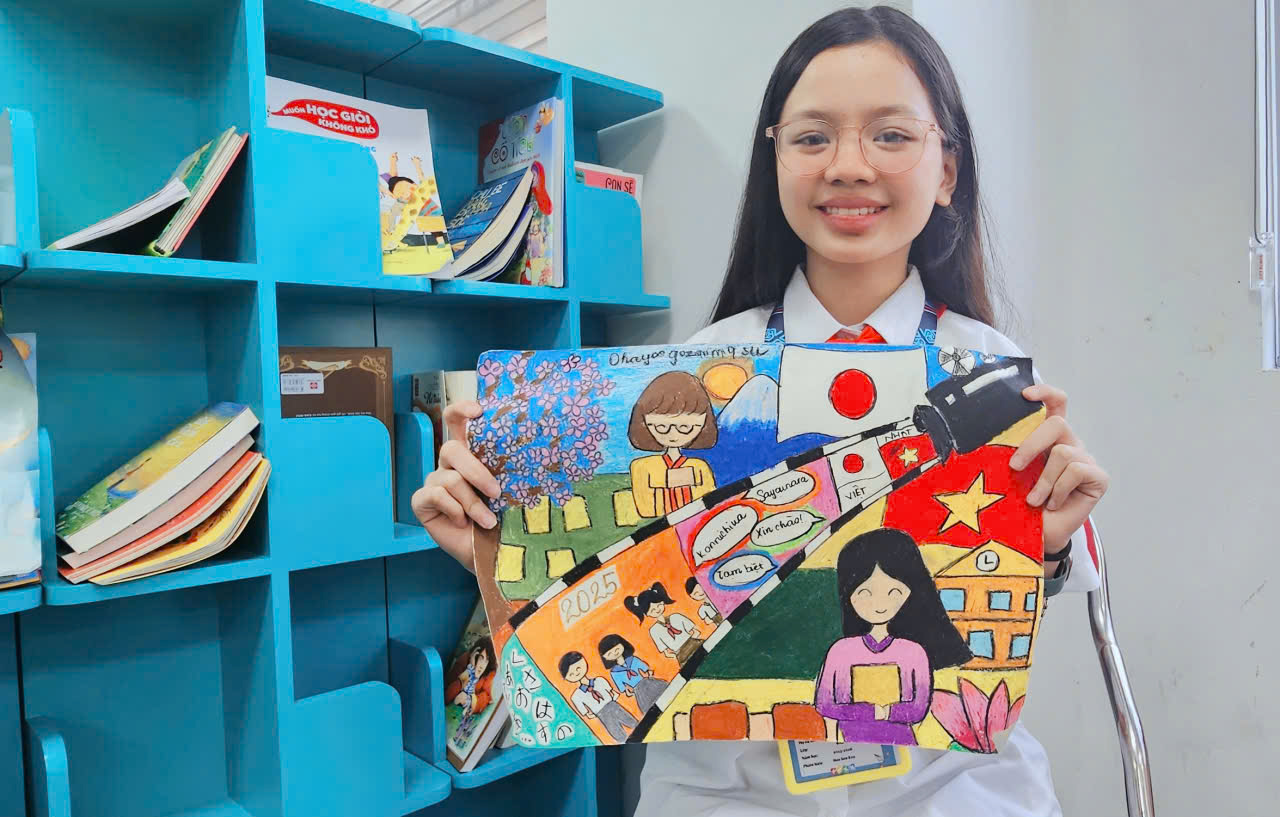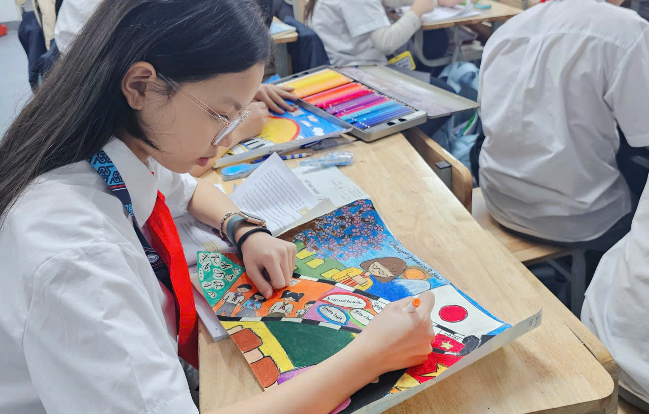 Điều khiến em thấy cuộc thi năm nay đặc biệt hơn là ở cách thể hiện: trong mỗi bức tranh, chúng em không chỉ gửi gắm cảm xúc qua màu sắc, hình ảnh mà còn qua những dòng chữ tiếng Nhật – yếu tố mang đậm nét văn hoá của xứ sở hoa anh đào. Nhờ đó, thay vì chỉ vẽ những hình ảnh quen thuộc, chúng em được thử sức với các ký tự Hiragana, Katakana và tìm hiểu thêm về tinh thần, vẻ đẹp của văn hoá Nhật Bản.