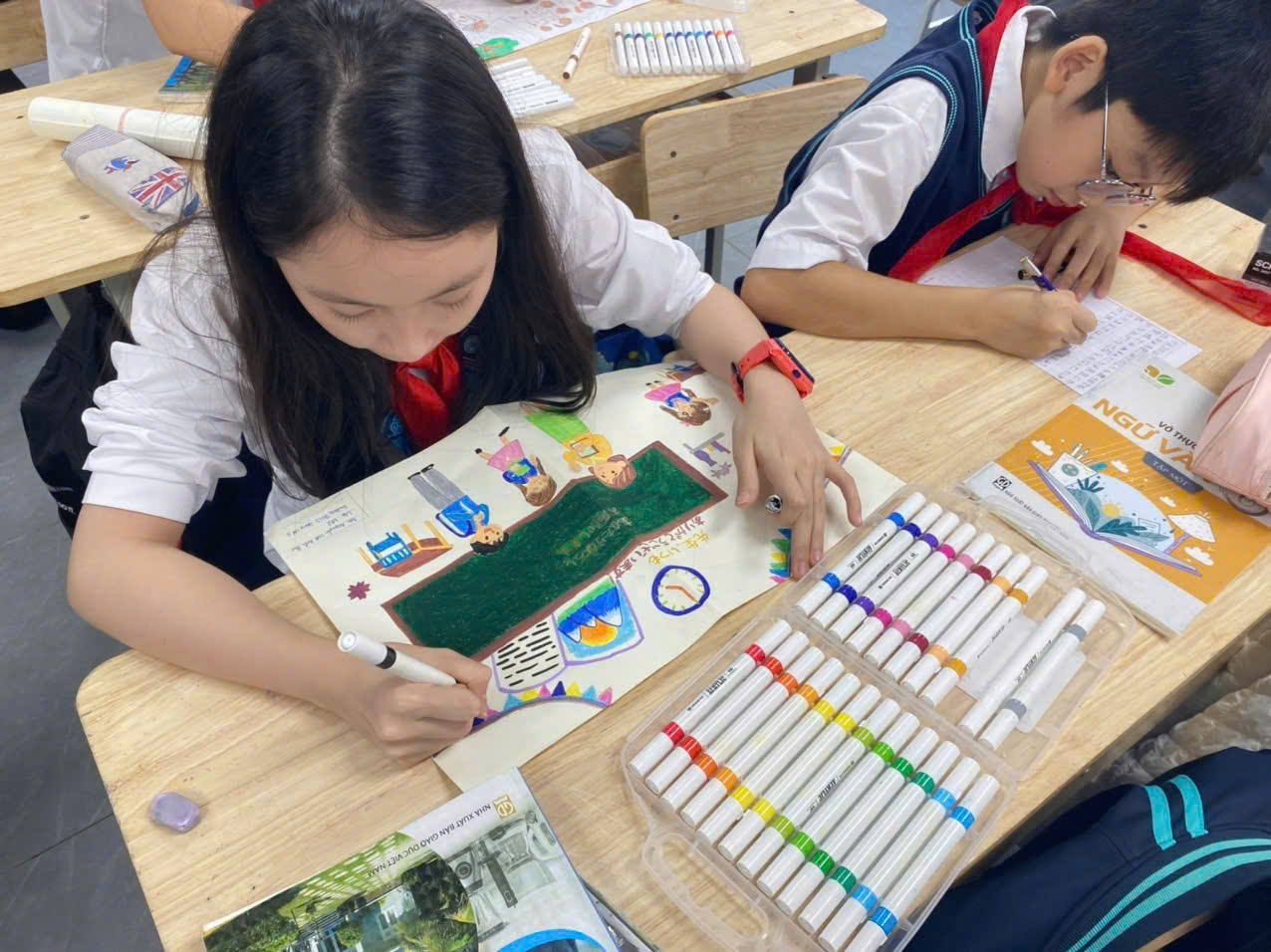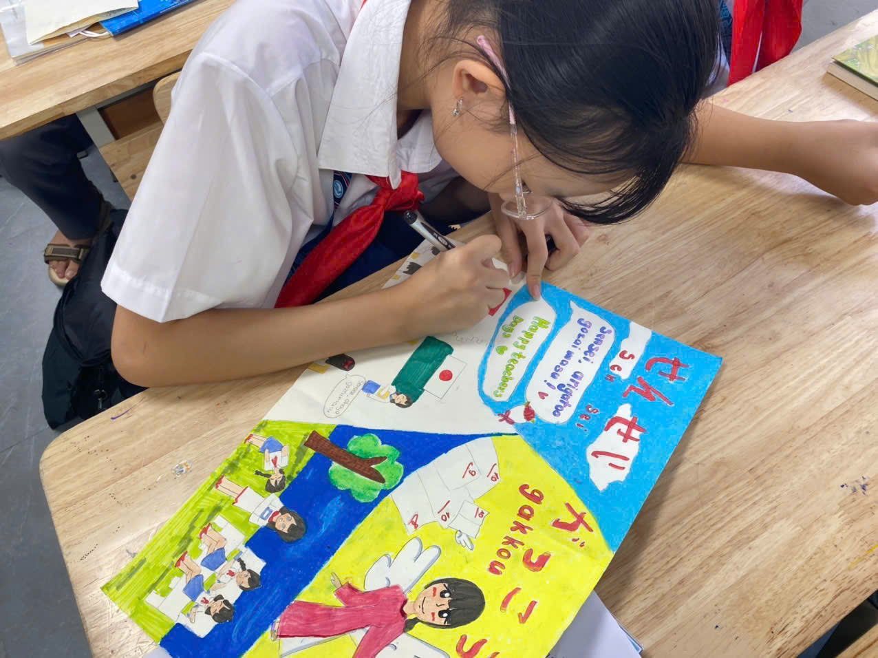 Trong lớp, ai cũng háo hức tham gia. Mỗi bức tranh là một câu chuyện riêng – có bạn vẽ sân trường đầy nắng, có bạn vẽ giờ học vui tươi, có bạn gửi lời cảm ơn đến cô giáo bằng những chữ Hiragana tròn trịa. Chúng em cùng nhau học thêm từ mới, cùng nhau cười khi phát hiện ra những cách biểu đạt thật đáng yêu của tiếng Nhật.