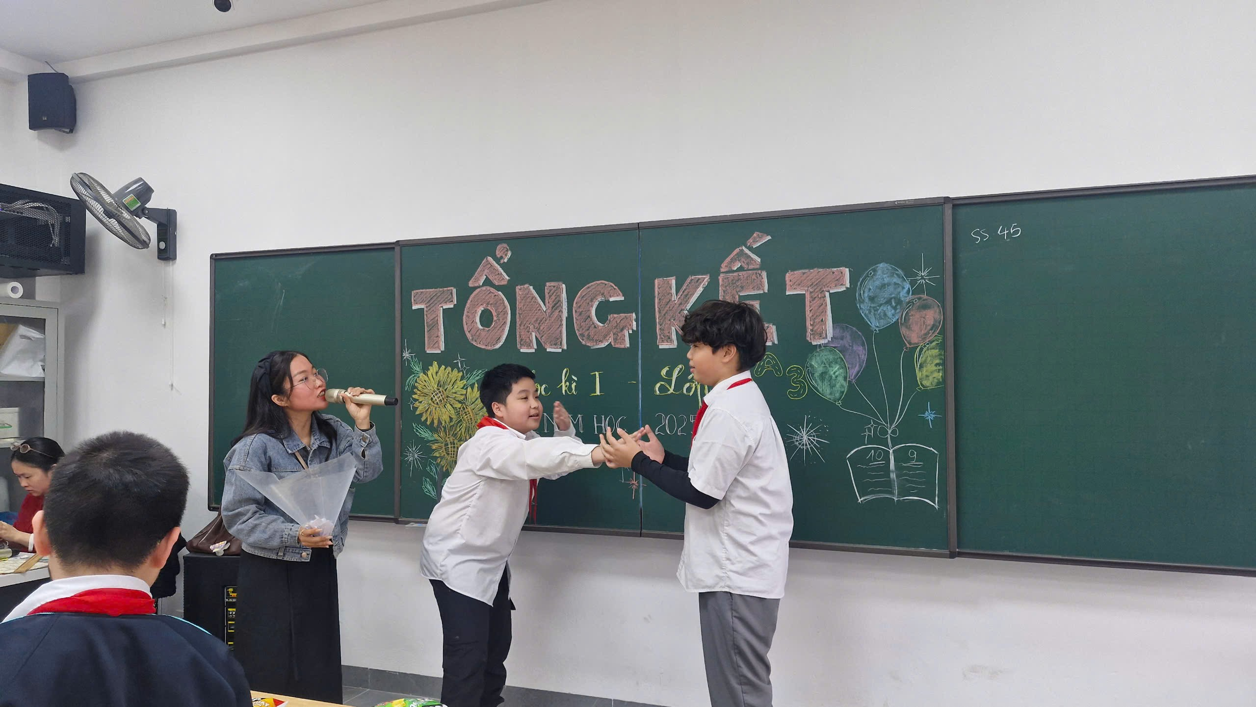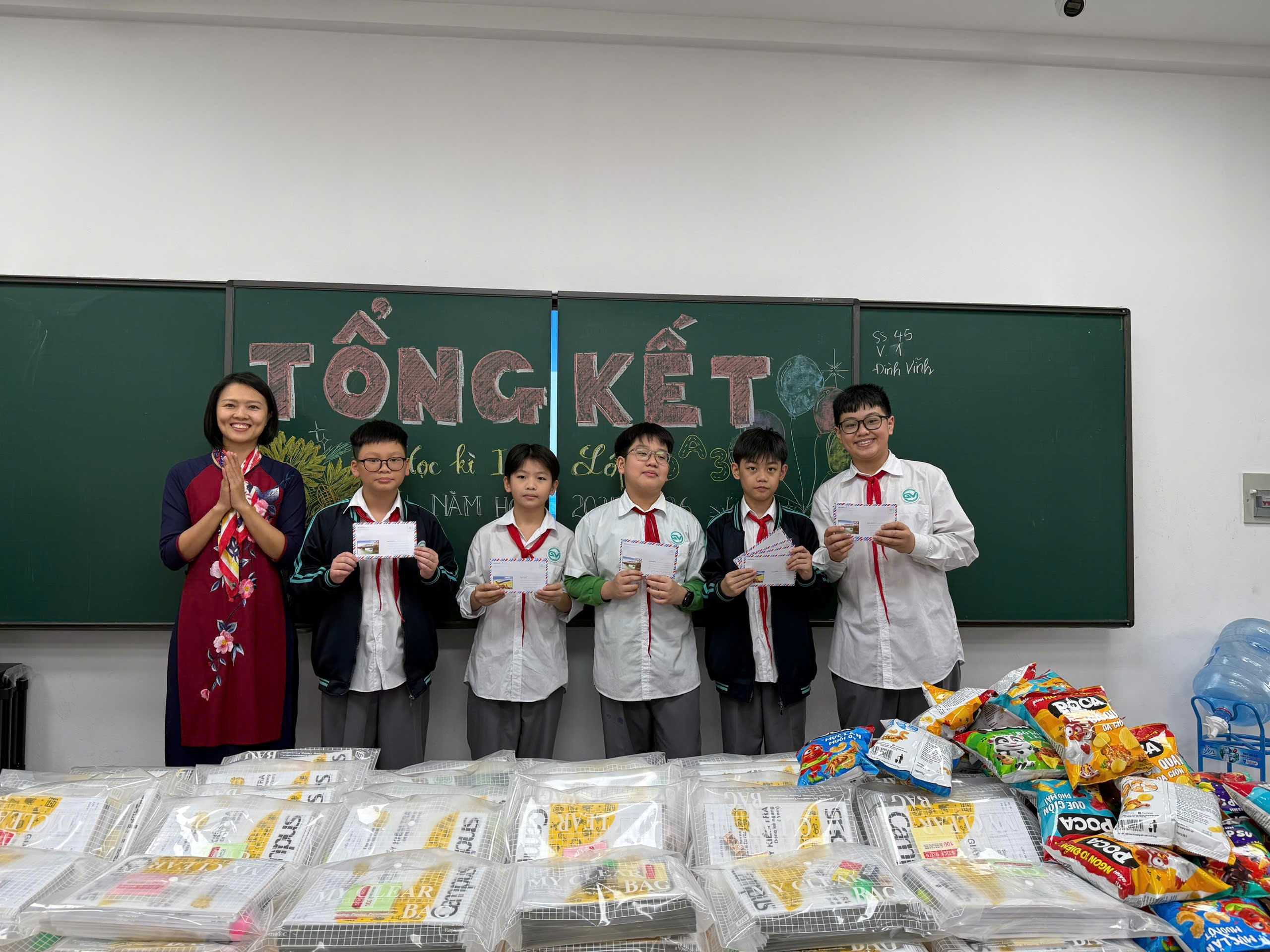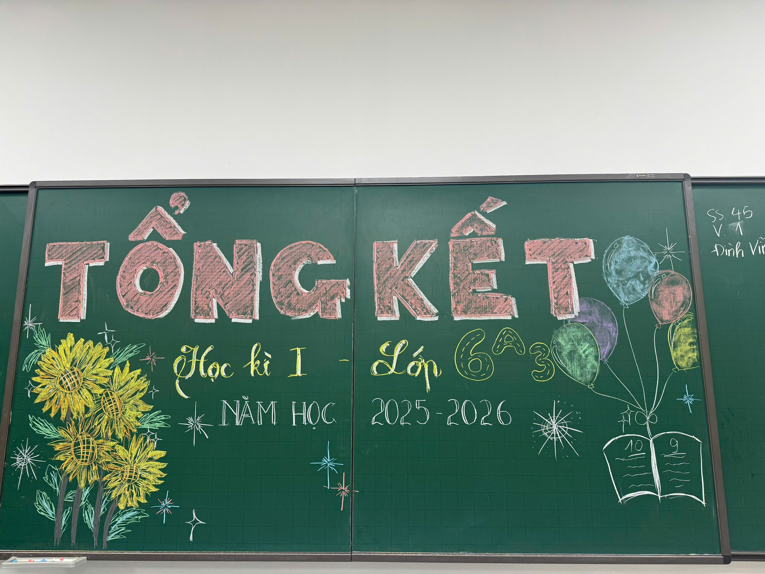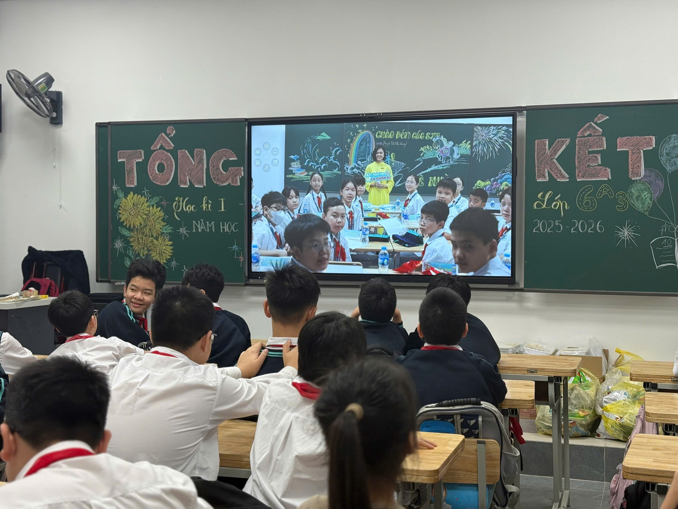 Ngay khi bước vào lớp, điều gây ấn tượng đầu tiên với tất cả mọi người là chiếc bảng được trang trí vô cùng sinh động. Dòng chữ “Tổng kết học kì I – Lớp 6A3” được viết nắn nót, rõ ràng và nổi bật ở chính giữa. Xung quanh là những hình vẽ đáng yêu, những bông hoa nhiều màu sắc, những ngôi sao lấp lánh và cả những lời chúc ý nghĩa do chính các bạn trong lớp tự tay chuẩn bị. Chiếc bảng không chỉ đơn thuần là nơi ghi bài, mà trong buổi tổng kết này, nó như một “tác phẩm nghệ thuật” chứa đựng tâm huyết, sự sáng tạo và tinh thần đoàn kết của cả tập thể lớp. Nhìn vào đó, ai cũng cảm nhận được sự háo hức và niềm tự hào của lớp 6A3 trong ngày đặc biệt này.