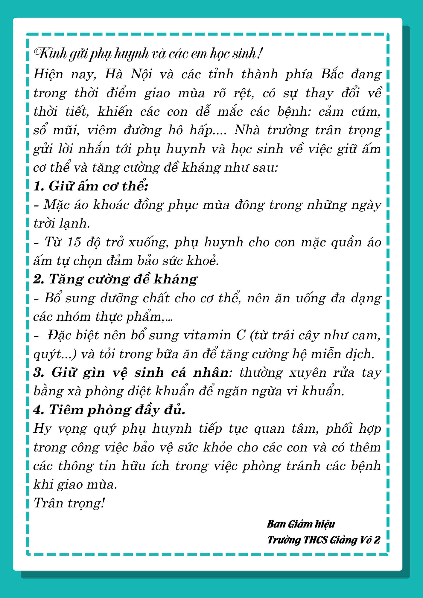 14/12 2024 Lời nhắn nhủ giữ gìn sức khoẻ từ trường THCS Giảng Võ 2, quận Ba Đình gửi tới các em học sinh 404 lượt xem Đánh giá: Tổng số điểm của bài viết là: 4/5 trong 4 đánh giá Chia sẻ: