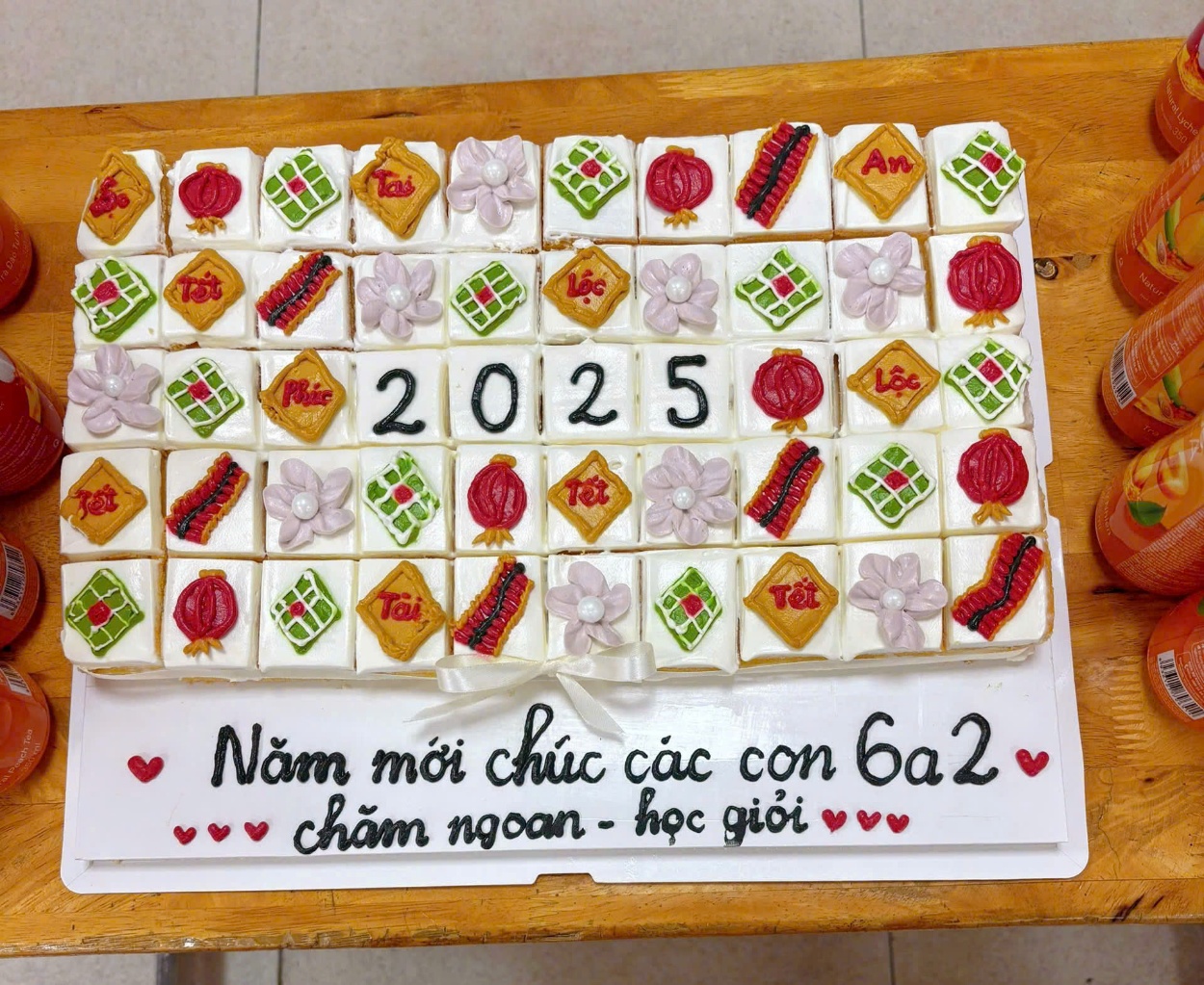 Buổi gặp mặt đầu xuân còn trở nên ngọt ngào hơn với chiếc bánh gato xinh xắn mang lời chúc: "Chúc các con lớp 6A2 Chăm chỉ - Học giỏi" do mẹ bạn Kỳ Phong chu đáo chuẩn bị.
