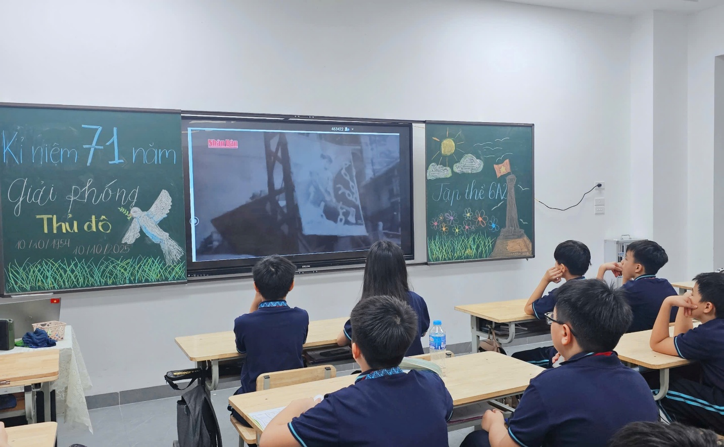 Mở đầu buổi sinh hoạt, cả lớp cùng xem video tư liệu về ngày 10/10/1954 – ngày đoàn quân giải phóng tiến vào Thủ đô Hà Nội. Những thước phim lịch sử chan chứa cảm xúc đã giúp các bạn học sinh hiểu hơn về niềm vui chiến thắng, về khoảnh khắc linh thiêng khi Hà Nội hoàn toàn giải phóng.