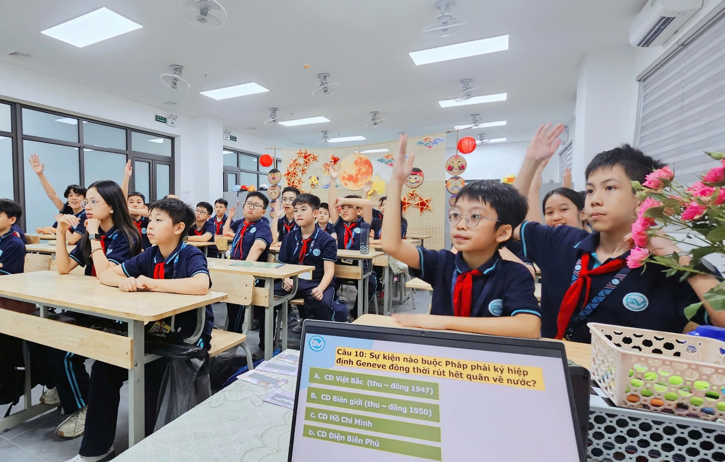 Không khí lớp học trở nên sôi nổi hơn khi bước vào trò chơi “Nhà sử học tài ba”. Các bạn học sinh chăm chú lắng nghe từng câu hỏi, nhiều cánh tay giơ cao đầy háo hức xin được trả lời. Mỗi khi có bạn trả lời đúng, cả lớp lại vỗ tay reo vui. Phần thưởng dành cho người trả lời đúng là “tấm thẻ bí mật” – ẩn chứa những lời chúc hoặc món quà nhỏ dễ thương. Tiếng cười, tiếng hò reo vang khắp lớp khi từng “thẻ may mắn” được cào ra, mang đến bất ngờ cho những bạn nhận quà.