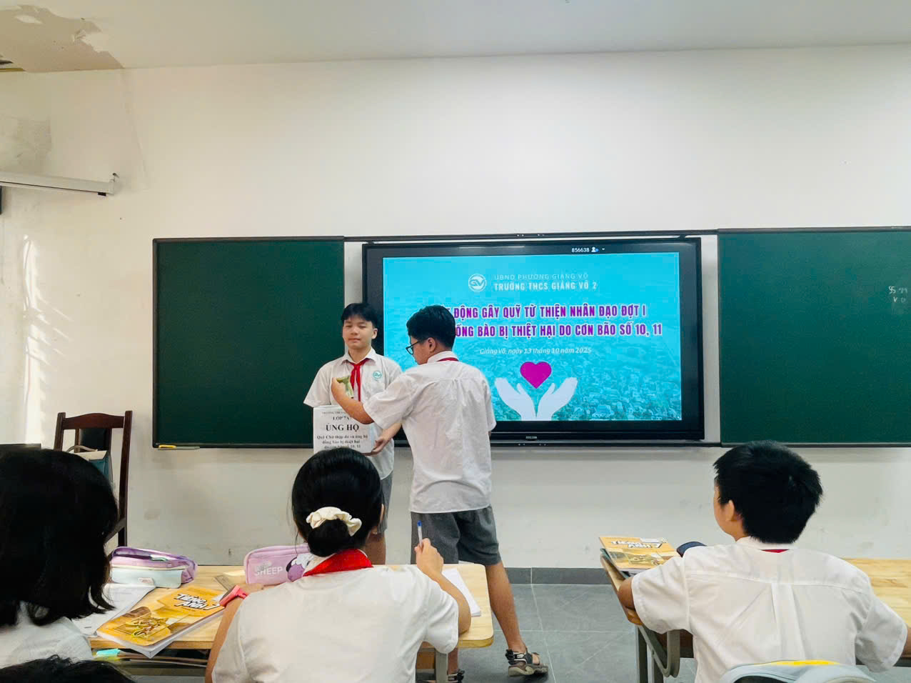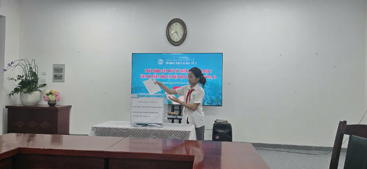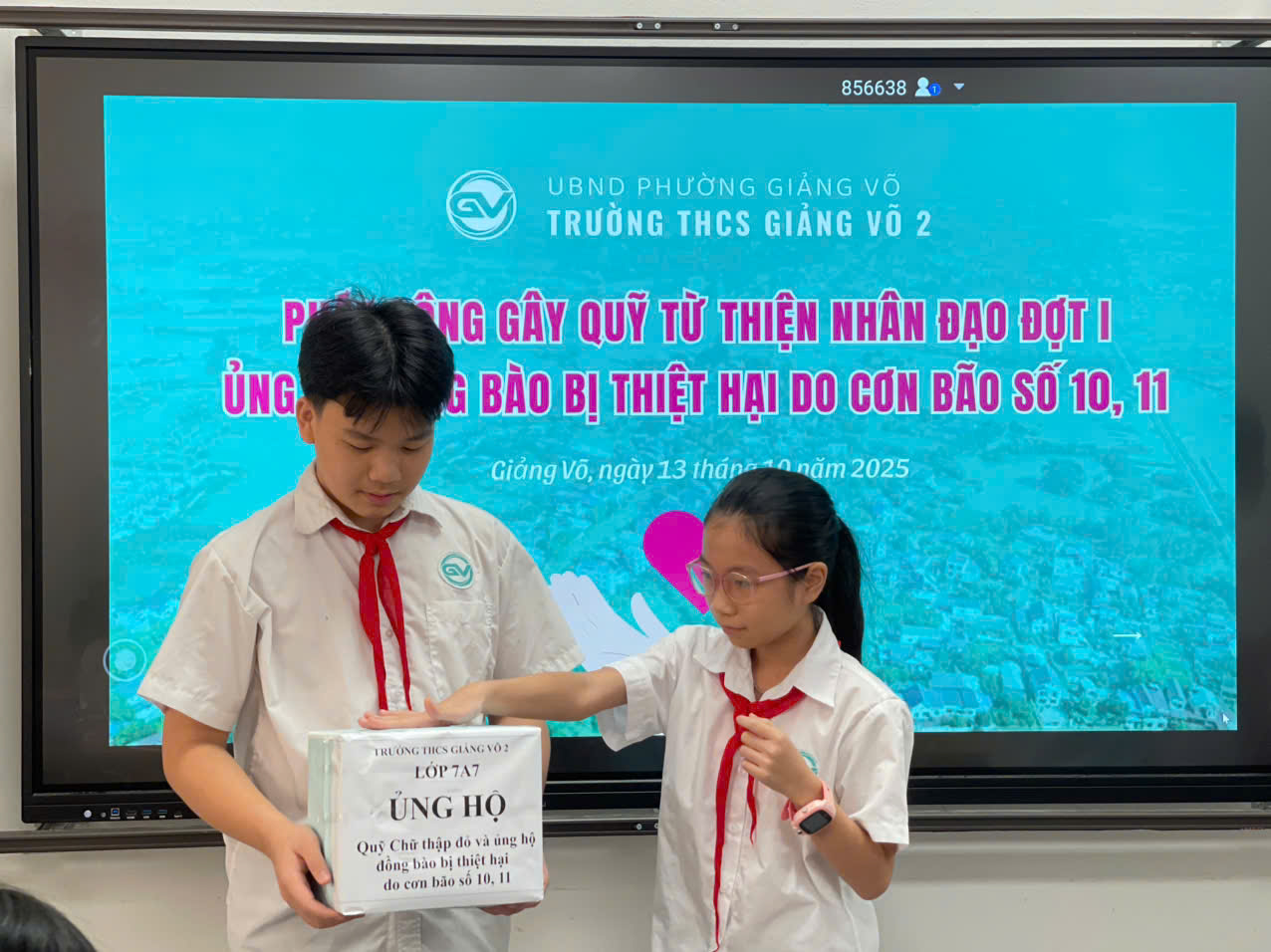 Trong những ngày qua, biết bao gia đình đã phải chịu cảnh mất mát cả về tinh thần lẫn vật chất do ảnh hưởng của bão lũ, nhiều ngôi nhà, tài sản của người dân bị cuốn trôi, nụ cười trẻ thơ cũng dần trở nên mờ nhạt sau cơn bão dữ. Thấy được hình ảnh khó khăn ấy, tập thể lớp 7A7 đã chung tay hưởng ứng phong trào gây quỹ và đóng góp ủng hộ cho bà con nhân dân bị thiệt hại do cơn bão số 10, 11 do trường THCS Giảng Võ 2 phát động với tinh thần “ Lá lành đùm lá rách ”
