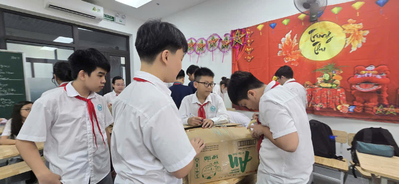 Hình ảnh các thành viên khỏe mạnh của lớp 7A7 đang cùng nhau đóng gói vật tư một cách cẩn thận để gửi tới đồng bào thân yêu.