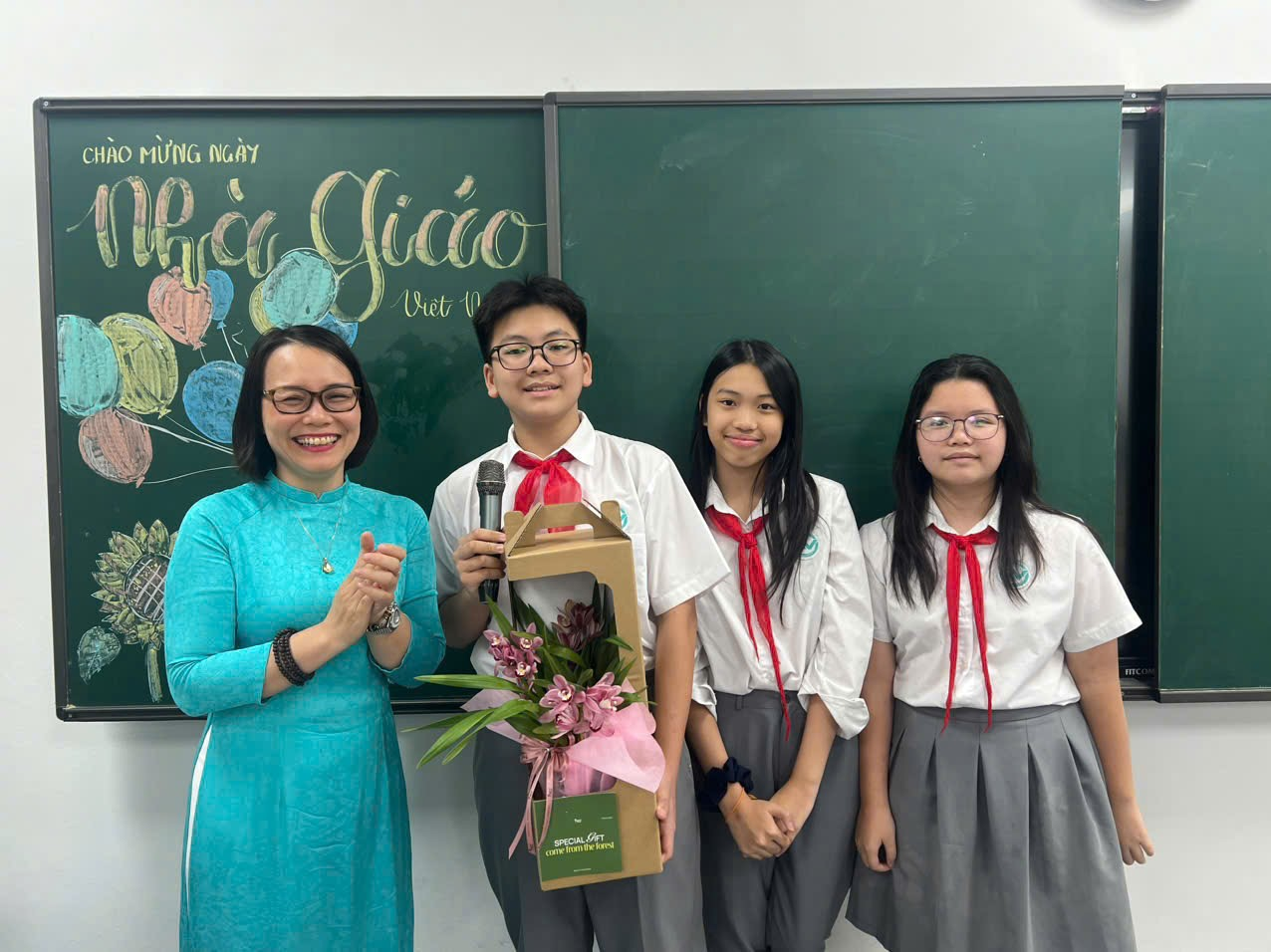 Khép lại hành trình tặng hoa là khoảnh khắc đặc biệt nhất: trao bó hoa tươi thắm dành riêng cho cô chủ nhiệm. Cô là người luôn theo dõi từng bước trưởng thành của chúng con, thấu hiểu từng cá tính riêng của mỗi bạn, nhắc nhở khi chúng con sai và chia vui khi lớp đạt được những thành tích tốt. Cô dành cho chúng con những lời nhắn nhủ dịu dàng nhưng sâu sắc, đồng thời động viên cả lớp cố gắng học tập và rèn luyện tốt hơn mỗi ngày. Giây phút ấy khiến cả lớp 8A1 xúc động, cảm nhận rõ ràng rằng tình cảm thầy trò không chỉ gói gọn trong sách vở hay điểm số, mà còn là sự quan tâm, hy sinh và kiên nhẫn mà cô luôn dành cho lớp.