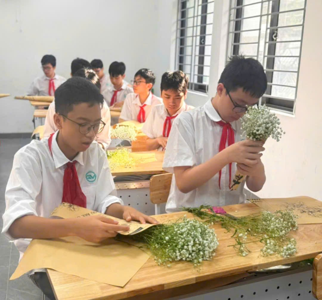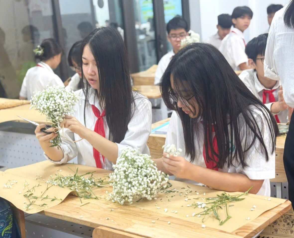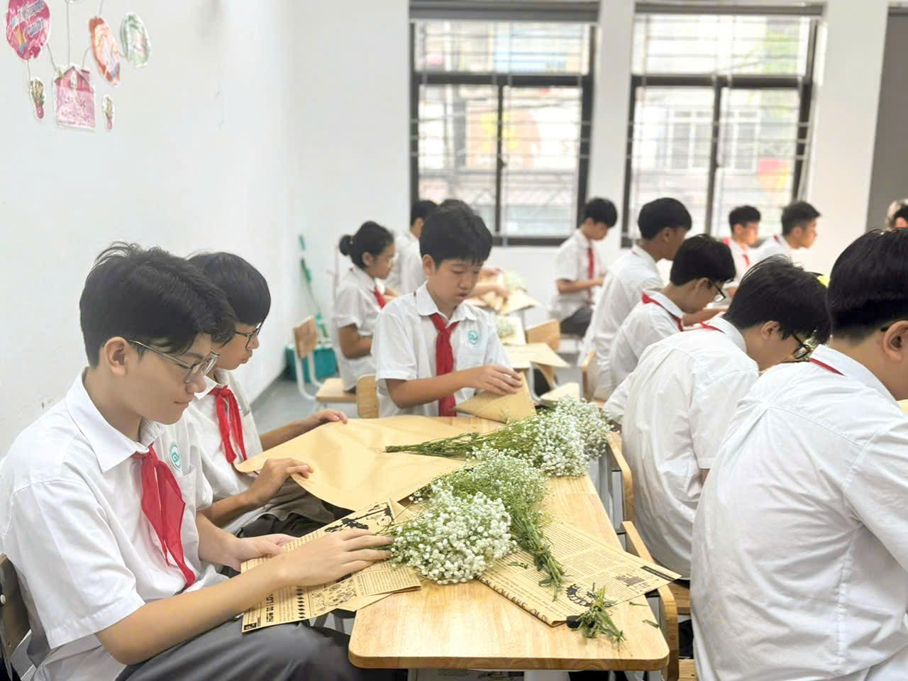 Ngay từ sáng sớm, lớp học đã rộn ràng tiếng cười. Những đôi tay khéo léo của học sinh 9A4 miệt mài cắt dán, gói hoa, thắt ruy băng… tạo nên những bó hoa xinh xắn, những tấm thiệp nhỏ gửi tặng cô giáo chủ nhiệm Vũ Thị Thu Trang và những người mẹ thân yêu ở nhà. Mỗi bông hoa, mỗi lời chúc đều chất chứa tình cảm chân thành – giản dị mà sâu sắc, như cách các bạn gửi đi lời tri ân nhân ngày đặc biệt này.