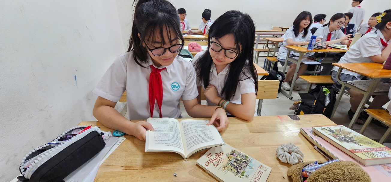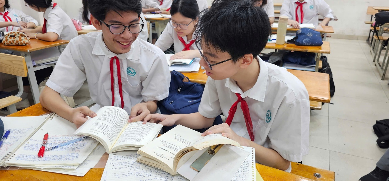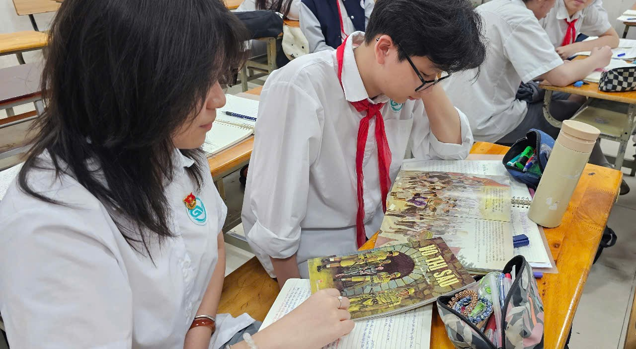 Không chỉ dừng lại ở buổi sinh hoạt, học sinh lớp 9A7 còn duy trì hoạt động đọc sách hàng ngày trong giờ ra chơi, cùng nhau trao đổi, chia sẻ kiến thức, tìm kiếm những ngữ liệu liên hệ đa dạng để làm giàu vốn hiểu biết, hỗ trợ tốt hơn cho các bài kiểm tra môn Ngữ văn.