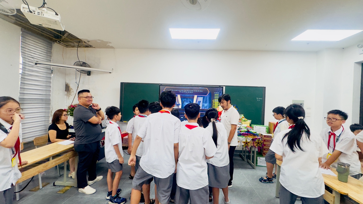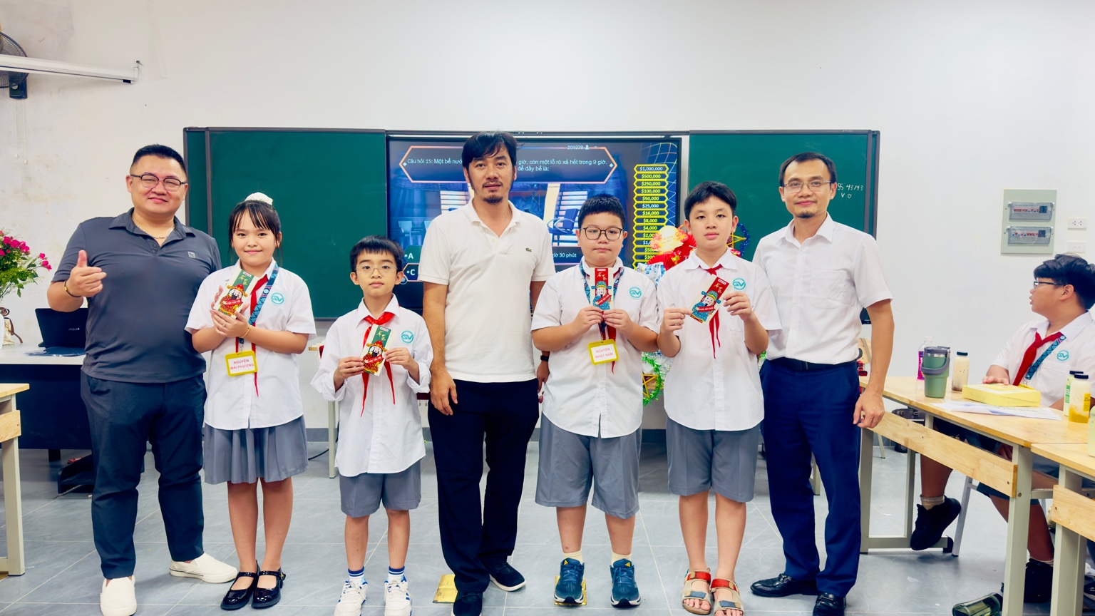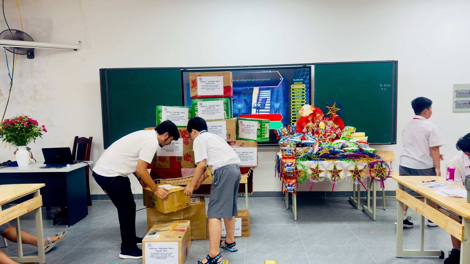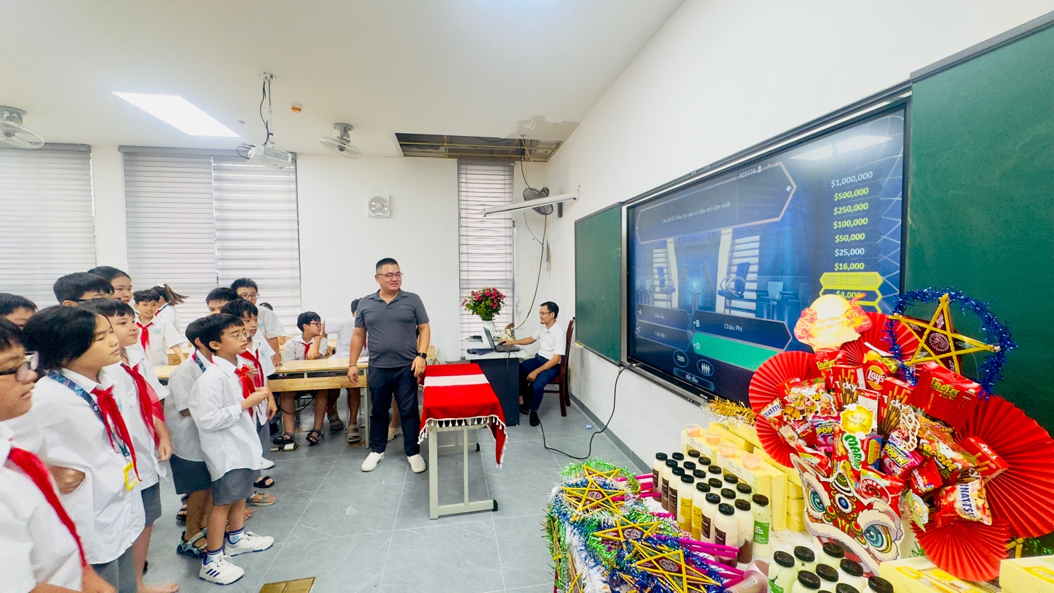 Ngay từ buổi chiều chuẩn bị, không khí trong lớp đã rộn ràng. Phòng học quen thuộc được trang hoàng rực rỡ với đèn ông sao, mâm cỗ đầy ắp bánh kẹo, trái cây, sữa… cùng sắc đỏ của khăn quàng và tiếng cười giòn tan của các bạn nhỏ. Điểm nhấn của buổi liên hoan là game show “Ai là triệu phú – phiên bản 6A1” – nơi các tổ cùng nhau thi tài qua những câu hỏi thú vị. Mỗi tổ đều có quyền “trợ giúp đặc biệt”từ thầy chủ nhiệm yêu quý, tạo nên những khoảnh khắc cười nghiêng ngả và những tràng pháo tay giòn giã. Mỗi câu trả lời đúng không chỉ mang lại tiếng cười mà còn gắn kết thêm tinh thần đoàn kết, hợp tác và sáng tạo của các thành viên trong từng tổ. Không khí Trung thu ùa về, ấm áp và rộn ràng như chưa từng bị bão giông ngăn lại.