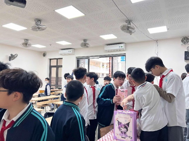 Hình ảnh các bạn nam trao tận tay các món quà đầy ý nghĩa đến các bạn nữ trong tập thể 7A3 và cô giáo