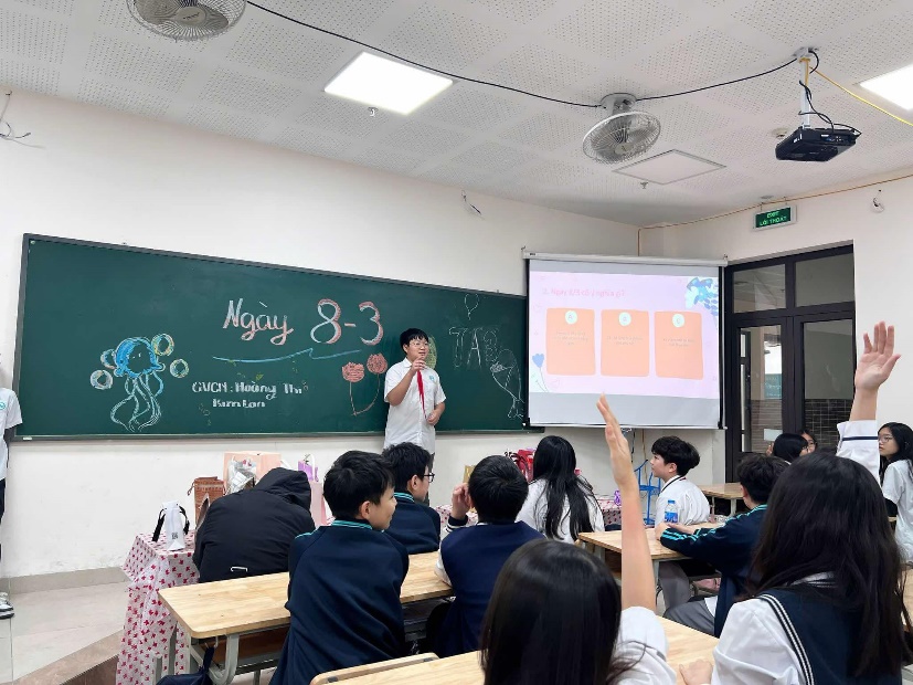 Mở đầu chương trình, bạn Lâm Phúc đại diện các bạn nam gửi lời chúc tốt đẹp nhất đến cô giáo và các bạn nữ. Tiếp theo, lớp trưởng Giáp Gia Lương đã giới thiệu về lịch sử và ý nghĩa của ngày Quốc tế Phụ nữ, giúp cả lớp hiểu rõ hơn về ngày lễ quan trọng này. Không khí càng thêm sôi động khi bạn Đăng Khanh tổ chức một trò chơi thú vị với những câu hỏi liên quan đến ngày 8/3, kèm theo nhiều phần quà nhỏ dành cho các bạn nữ trả lời đúng.