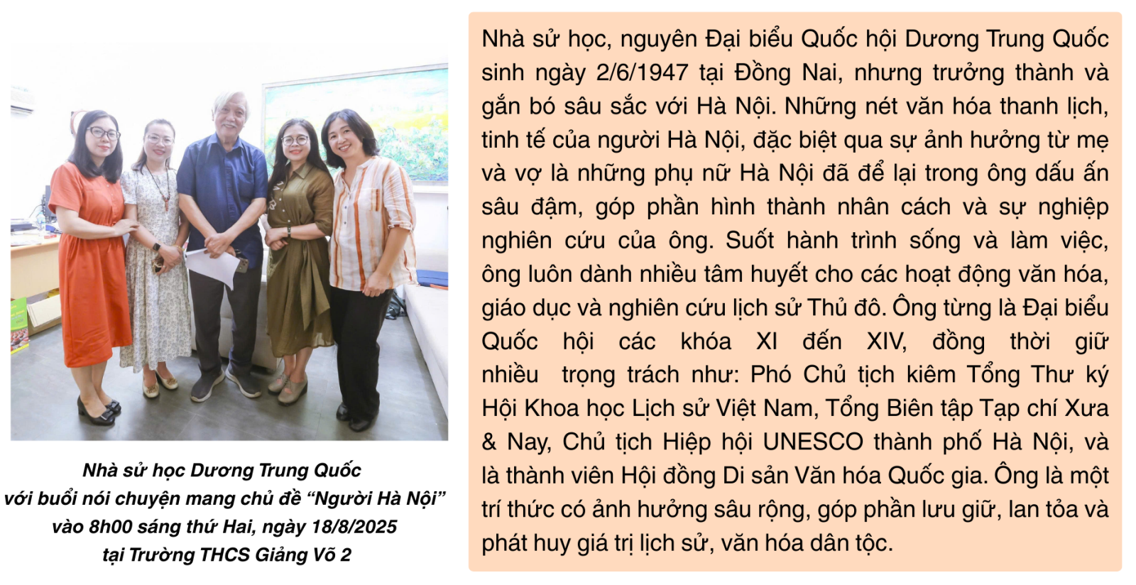 Buổi trò chuyện của nhà sử học Dương Trung Quốc không chỉ là dịp để cán bộ, giáo viên nhà trường cùng nhìn lại truyền thống quý báu của mảnh đất Giảng Võ - nơi ngôi trường THCS Giảng Võ 2 đang được xây dựng, vùng đất từng vang danh với tinh thần võ học, nghĩa khí và khí phách của kinh thành Thăng Long xưa, mà còn góp phần làm sáng rõ những phẩm chất đáng quý của người Hà Nội: thanh lịch, nghĩa tình, văn minh, tự trọng và khát vọng cống hiến. Những chia sẻ của ông chắc chắn sẽ là nguồn cảm hứng để tập thể cán bộ, giáo viên nhà trường thêm gắn bó, tự hào và tiếp tục nỗ lực xây dựng một môi trường giáo dục nhân văn, trí tuệ, giàu bản sắc Thủ đô. “Để là người Hà Nội” – đó không chỉ là câu chuyện về quê hương, mà còn là lời nhắc nhở về cách mỗi chúng ta sống, ứng xử và cống hiến từng ngày cho cộng đồng.