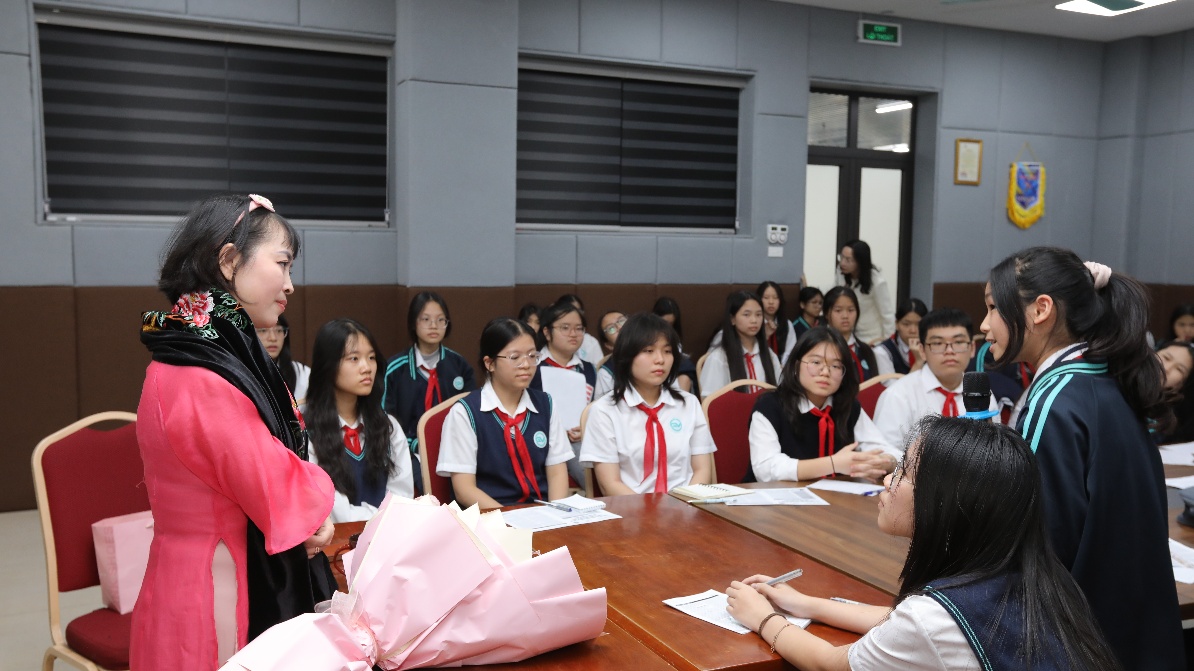 Nhà thơ Bảo Ngọc lắng nghe chia sẻ của các bạn học sinh