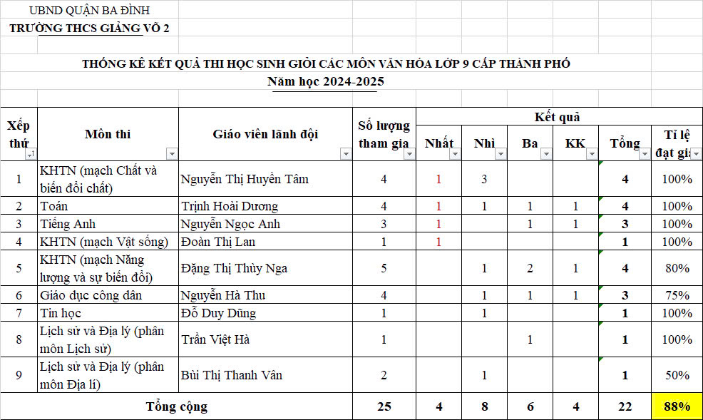 Thành tích đáng tự hào của trường THCS Giảng Võ 2Với 25 học sinh tham gia dự thi ở 9 môn học, kết quả đạt được vô cùng ấn tượng: 22/25 học sinh đạt giải, chiếm 88%. Đặc biệt, có 4 giải Nhất ở các môn KHTN (mạch Chất và biến đổi chất, mạch Vật sống), Toán và Tiếng Anh. Những con số này không chỉ phản ánh năng lực vượt trội của các em học sinh mà còn thể hiện sự đầu tư chăm chút và tâm huyết của các thầy cô giáo.