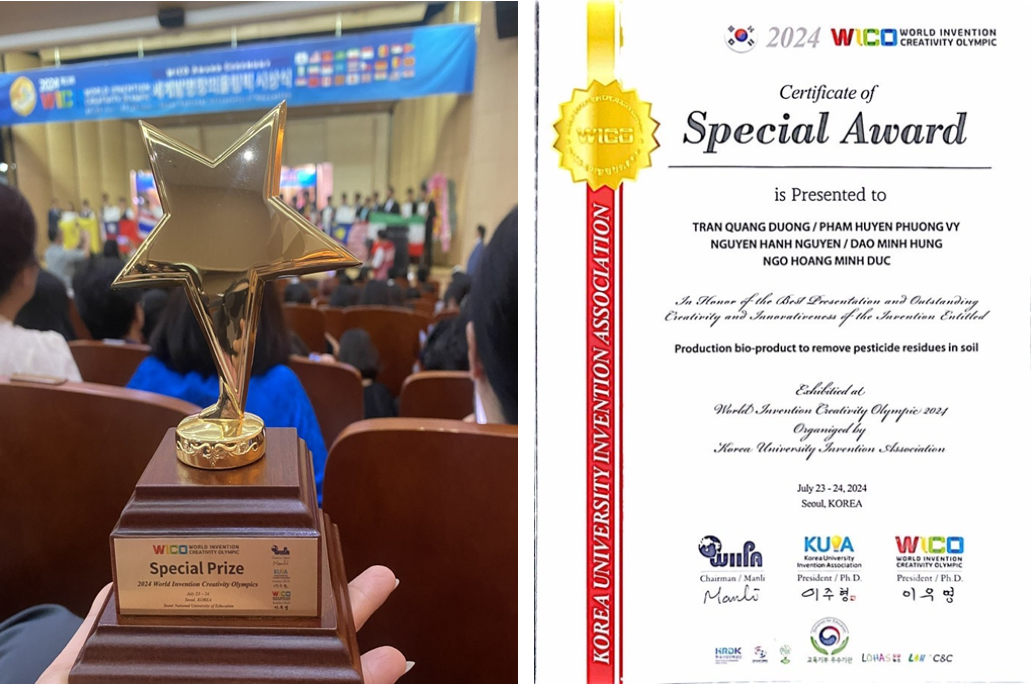 Đặc biệt, đề tài “Nghiên cứu tạo chế phẩm sinh học xử lí thuốc bảo vệ thực vật tồn dư trong đất” của Minh Hùng, Nhật Minh cùng các bạn còn được trao giải Special Award (cả cuộc thi chỉ có 5 giải này) - chứng nhận đặc biệt về tính mới, tính sáng tạo trong công trình nghiên cứu.
