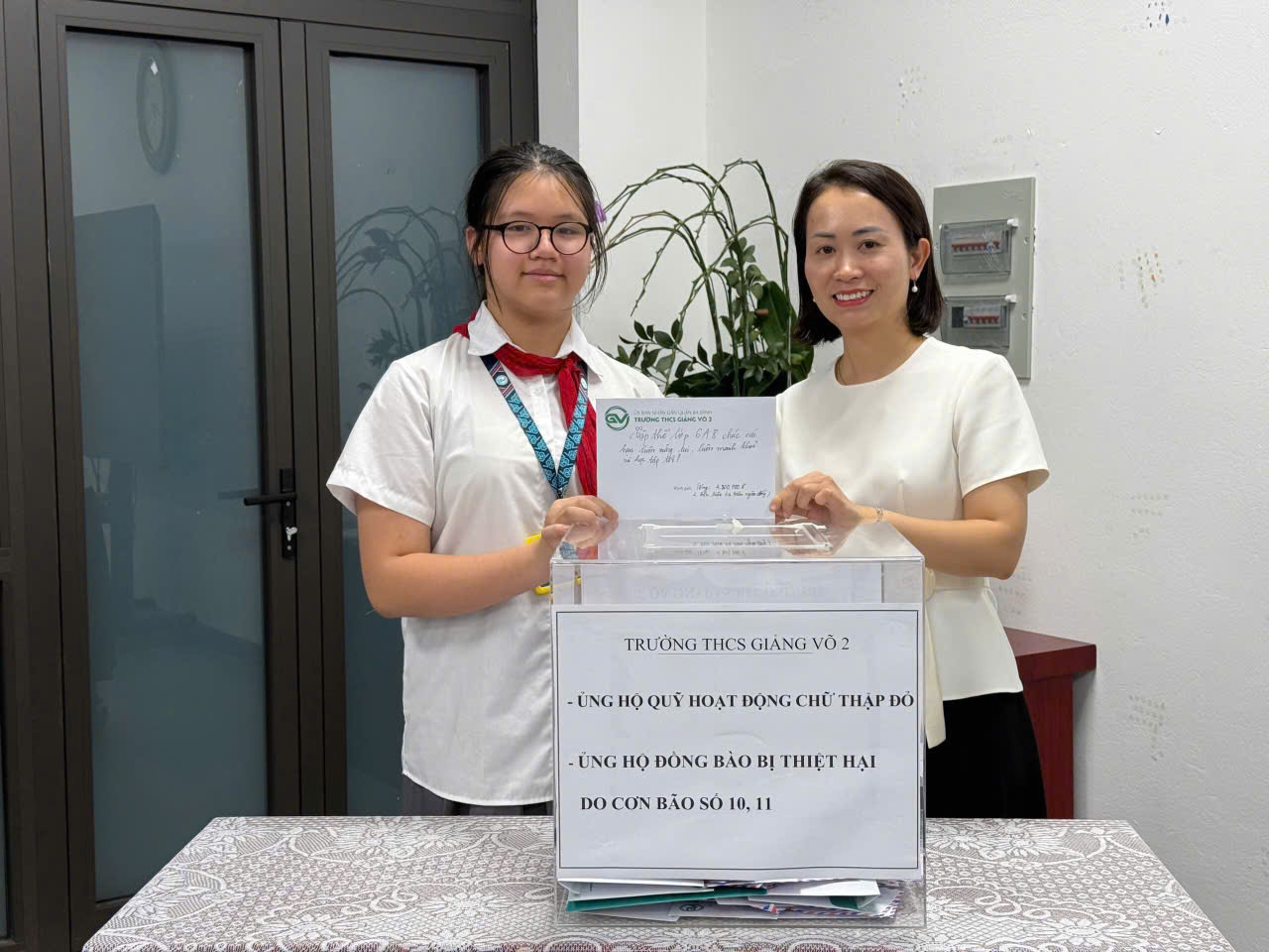 Cô và trò lớp 6A8 - Trường THCS Giảng võ 2 quyên góp ủng hộ đồng bào vùng bão lũ