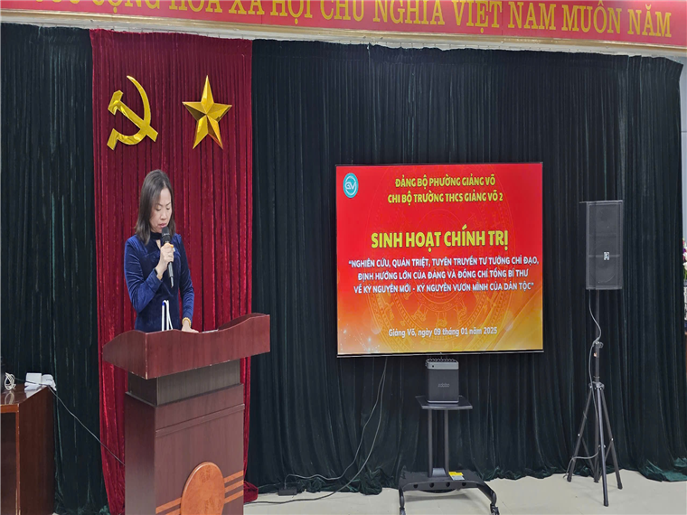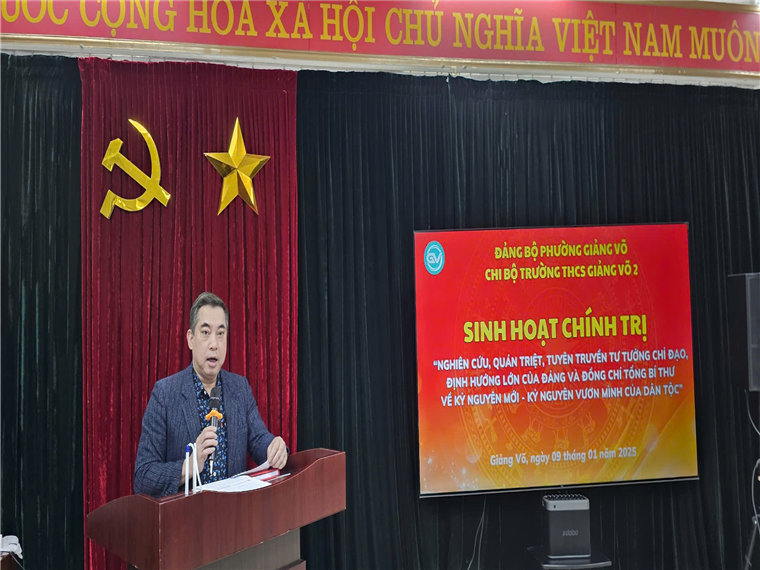 Thực hiện chỉ đạo của Đảng ủy phường Giảng Võ, sáng ngày 09/01/2024, Chi bộ trường THCS Giảng Võ 2 đã tổ chức buổi sinh hoạt chính trị với chủ đề “Nghiên cứu, quán triệt, tuyên truyền tư tưởng chỉ đạo, định hướng lớn của Đảng và đồng chí Tổng Bí thư về kỷ nguyên mới – kỷ nguyên vươn mình của dân tộc”.