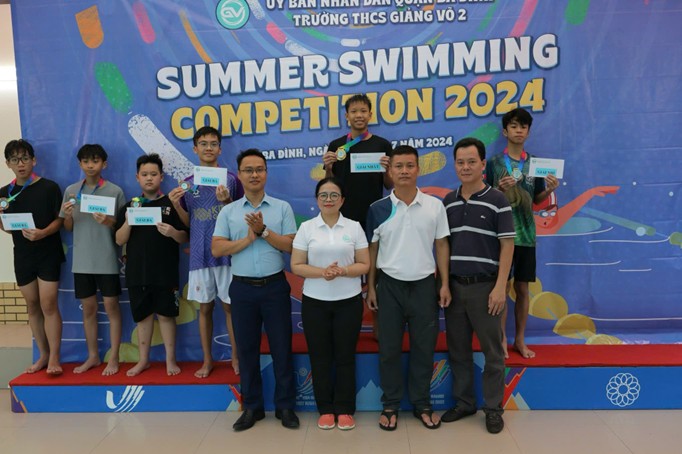 Ban giám hiệu trường THCS Giảng Võ 2 trao thưởng cho các em học sinh tham gia giải Bơi hè