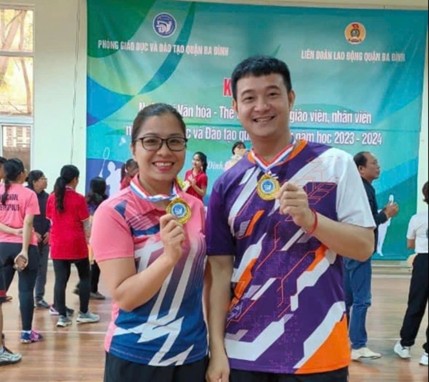Thầy Phùng Hải Sơn (phải) và cô Hoàng Thị Thu Hiền (trái) giành huy chương Vàng tại giải Cầu lông