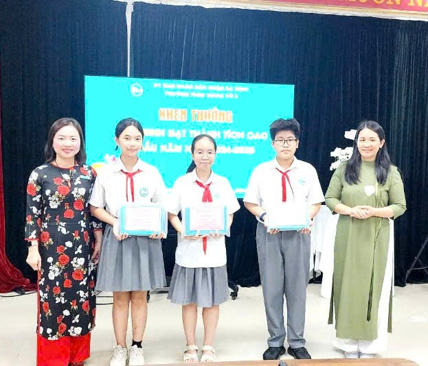 Học sinh Trần Bảo Minh (đứng giữa) nhận khen thưởng học sinh đạt điểm cao nhất khối 6 trong kỳ kiểm tra khảo sát đầu năm học