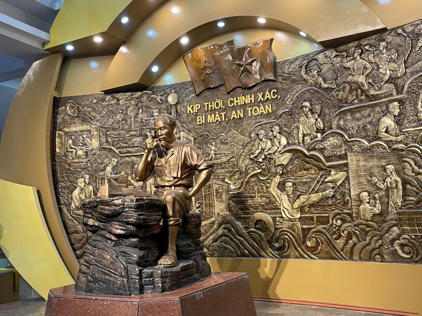 Bức tượng đồng khắc họa vị lãnh tụ vĩ đại Hồ Chí Minh tham gia công tác chỉ huy mặt trận qua điện đàm với lời khẩu hiệu của ngành Binh chủng thông tin: “Kịp thời, chính xác, bí mật, an toàn”