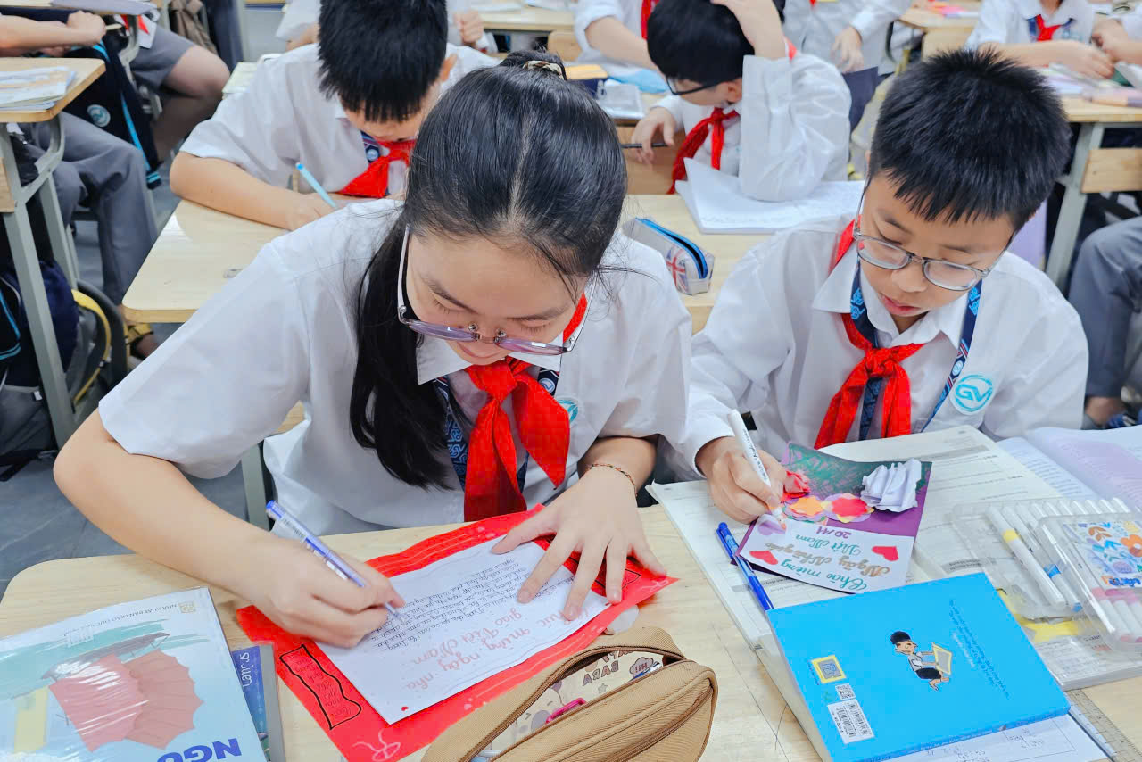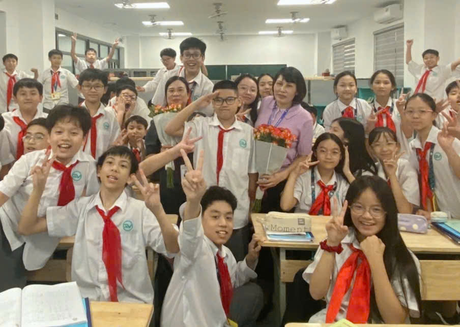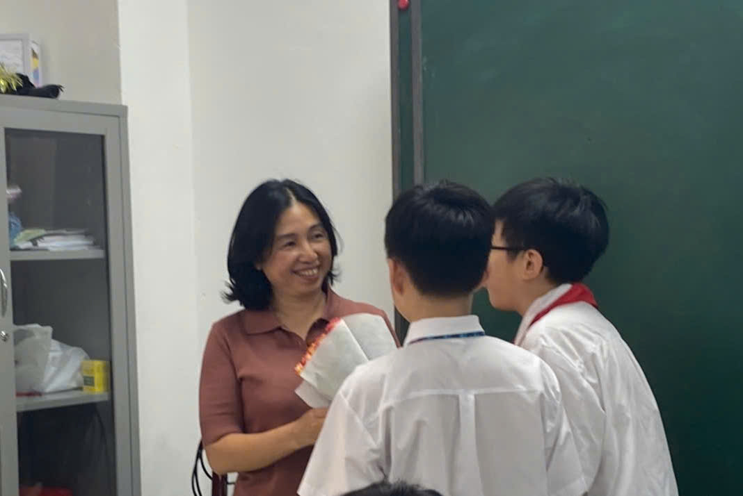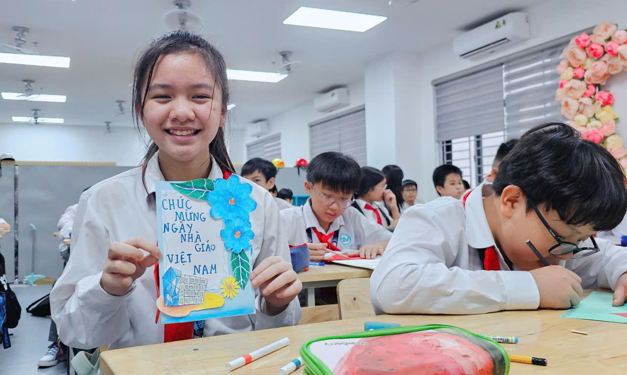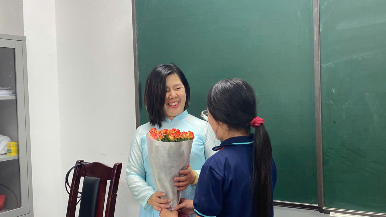 Không chỉ học tốt, lớp 6A2 còn cùng nhau làm thiệp và chuẩn bị hoa chúc mừng thầy cô nhân ngày Nhà giáo Việt Nam. Những tấm thiệp nhỏ xinh, được trang trí bằng giấy màu và nét chữ nắn nót, chứa đựng bao tình cảm chân thành. Khi những bó hoa tươi được trao tận tay, nụ cười rạng rỡ của thầy cô hòa cùng ánh mắt hồn nhiên của học trò, tạo nên khoảnh khắc thật ấm áp.