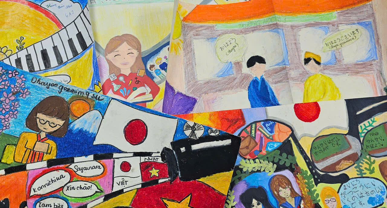 Những bức tranh rực rỡ sắc màu Việt – Nhật được các “họa sĩ nhỏ tuổi” lớp 6A2 say mê sáng tạo để tri ân thầy cô.