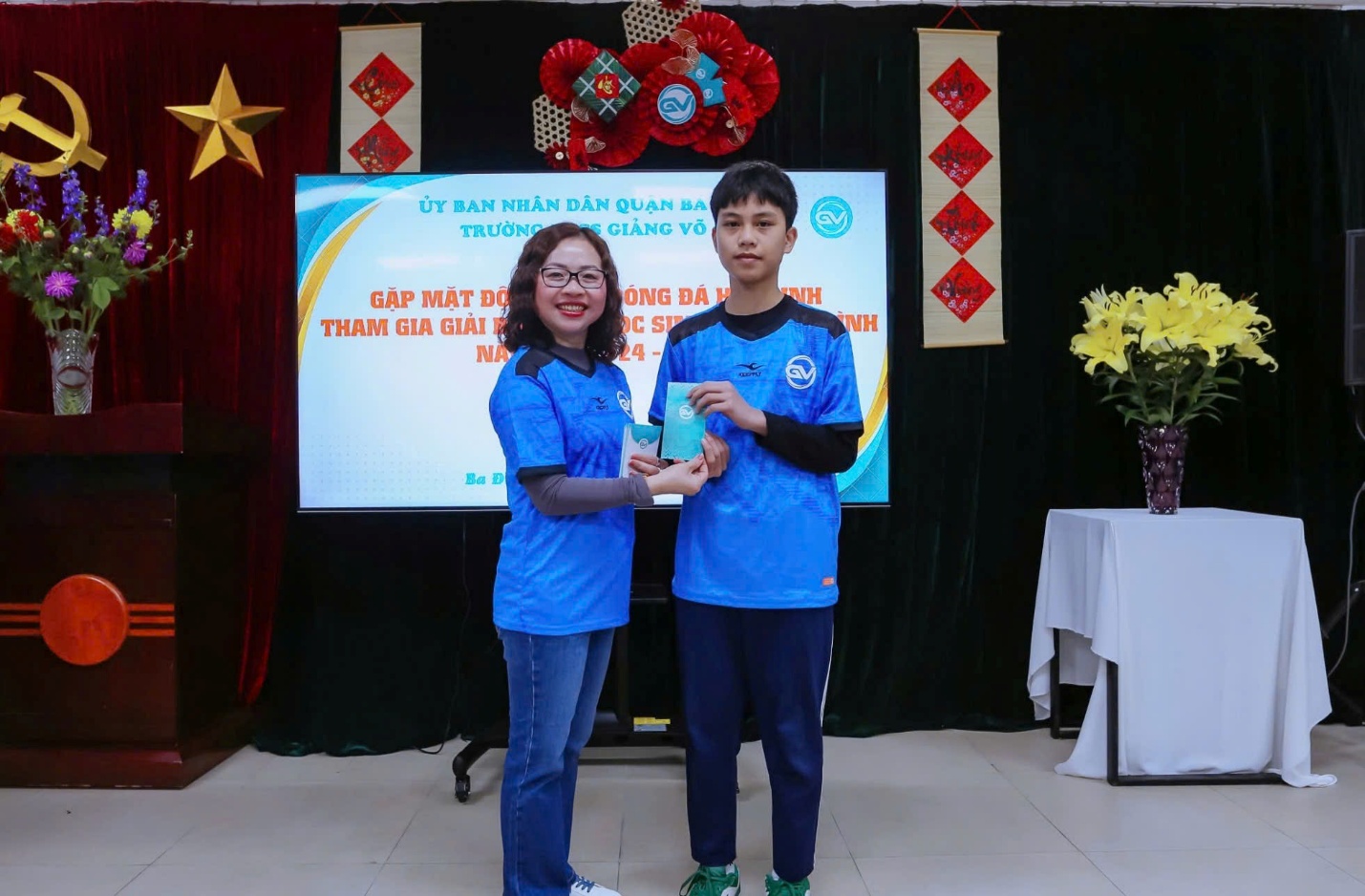 Cô giáo Phạm Thị Mai Hoa – Phó Hiệu trưởng nhà trường trao quà trong buổi ra mắt đội bóng cho bạn Phạm Tiến Minh – cầu thủ lập cú đúp giúp đội bóng trường THCS Giảng Võ 2 lội ngược dòng
