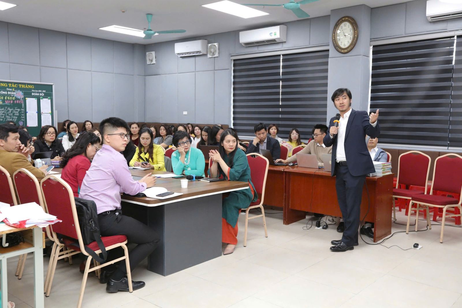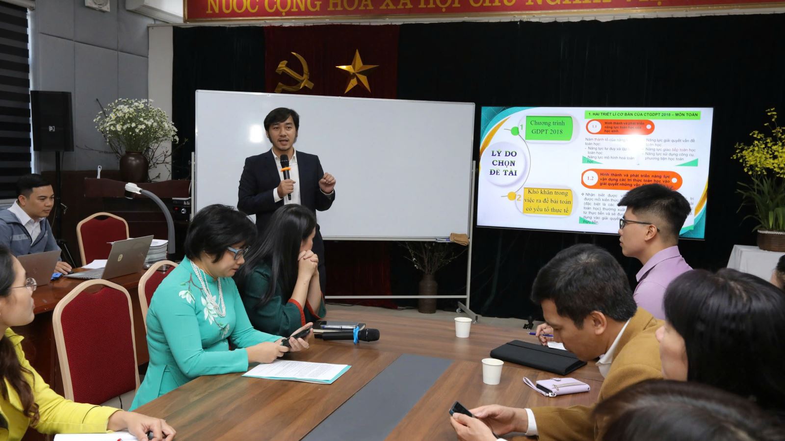 Thầy giáo Trịnh Hoài Dương trình bày những kinh nghiệm trong việc ra đề toán có yếu tố thực tế theo chương trình GDPT 2018 với giáo viên toàn quận