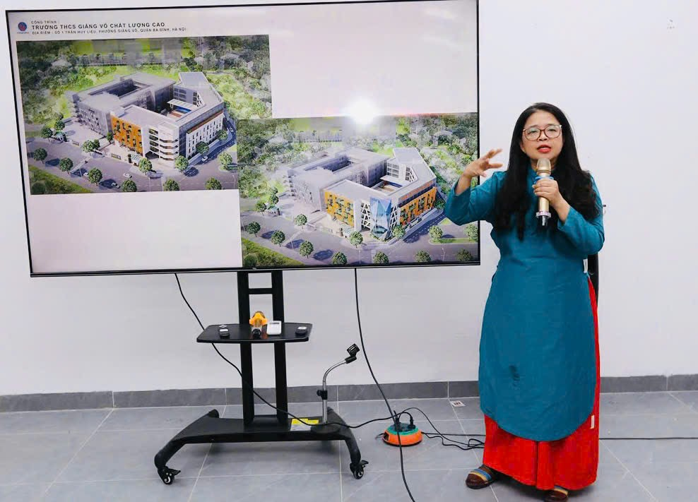 Chúng em được cô chủ nhiệm đưa đến phòng họp của cô Hiệu trưởng. Tại đây, đại diện các lớp đã lắng nghe cô Phạm Thị Hương Giang giới thiệu chi tiết về ngôi trường mới – hình ảnh ngôi trường lục giác độc đáo, được tách ra từ THCS Giảng Võ – ngôi trường có truyền thống lâu đời từ năm 1989. Giảng Võ 2 được định hướng trở thành trường công lập chất lượng cao của quận Ba Đình.