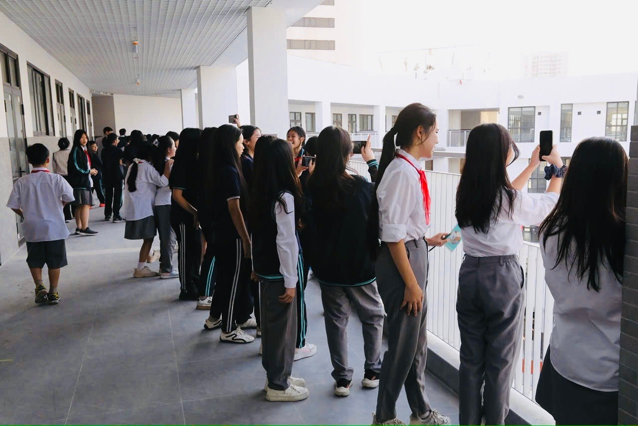 Trường khởi công ngày 10/5/2024 và chỉ sau hơn một năm, ngày khánh thành đã đến rất gần. Tốc độ thi công khẩn trương cùng sự giám sát sát sao của thầy cô thể hiện sự tâm huyết và quyết tâm mang lại môi trường học tập hiện đại nhất cho chúng em. Các phòng chức năng từ khu thể dục, phòng ăn, văn thư đến những lớp học đều được trang bị thiết bị thông minh: bảng tương tác, loa, điều hòa và camera thế hệ mới. Mỗi lớp học có hai hành lang – một lối vào lớp và một ban công hướng ra hồ, nơi những hàng cây rủ xuống tạo khung cảnh thơ mộng, bình yên.