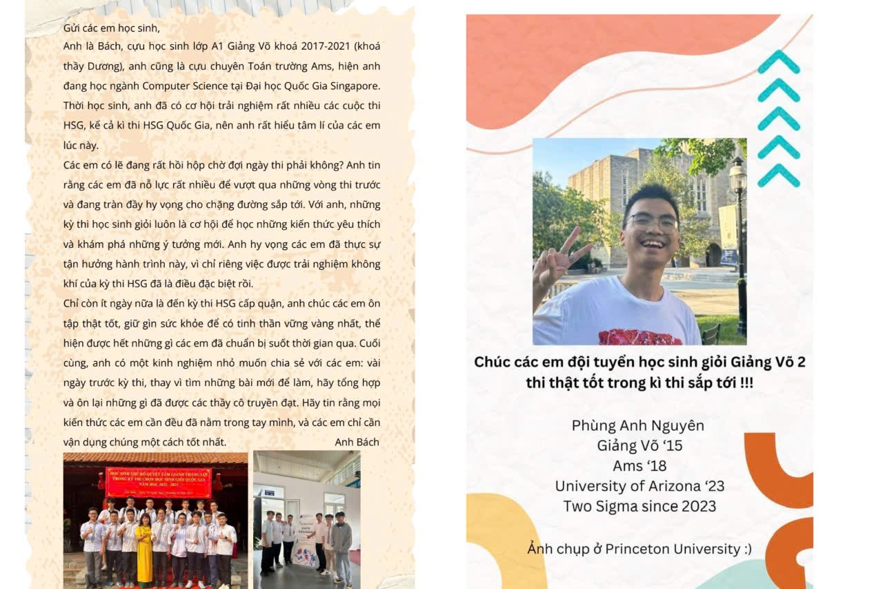 Anh Nguyễn Quang Bin (khoá 2011-2015 trường Giảng Võ) – cựu học trò của cô Phạm Thị Hương Giang và thầy Trịnh Hoài Dương – từng giành Huy chương Vàng Olympic Toán quốc tế 2018; giải nhì HSG Quốc gia môn toán lớp 11,12; giải nhất HSG Thành phố Hà Nội môn Toán năm lớp 9; từng học chuyên toán trường KHTN và theo học chuyên ngành Toán tại đại học Chicago Mỹ. Quang Bin nhắn nhủ đến các em học sinh của trường Giảng Võ 2: Kiến thức các em đã học được là hành trang quan trọng, nhưng sự tự tin và tinh thần quyết tâm sẽ là chìa khóa giúp các em chinh phục kỳ thi này. Hãy tin vào bản thân, tập trung và cố gắng hết mình. Kỳ thi chỉ là một chặng đường nhỏ, và thành công sẽ đến với những ai không ngừng nỗ lực.