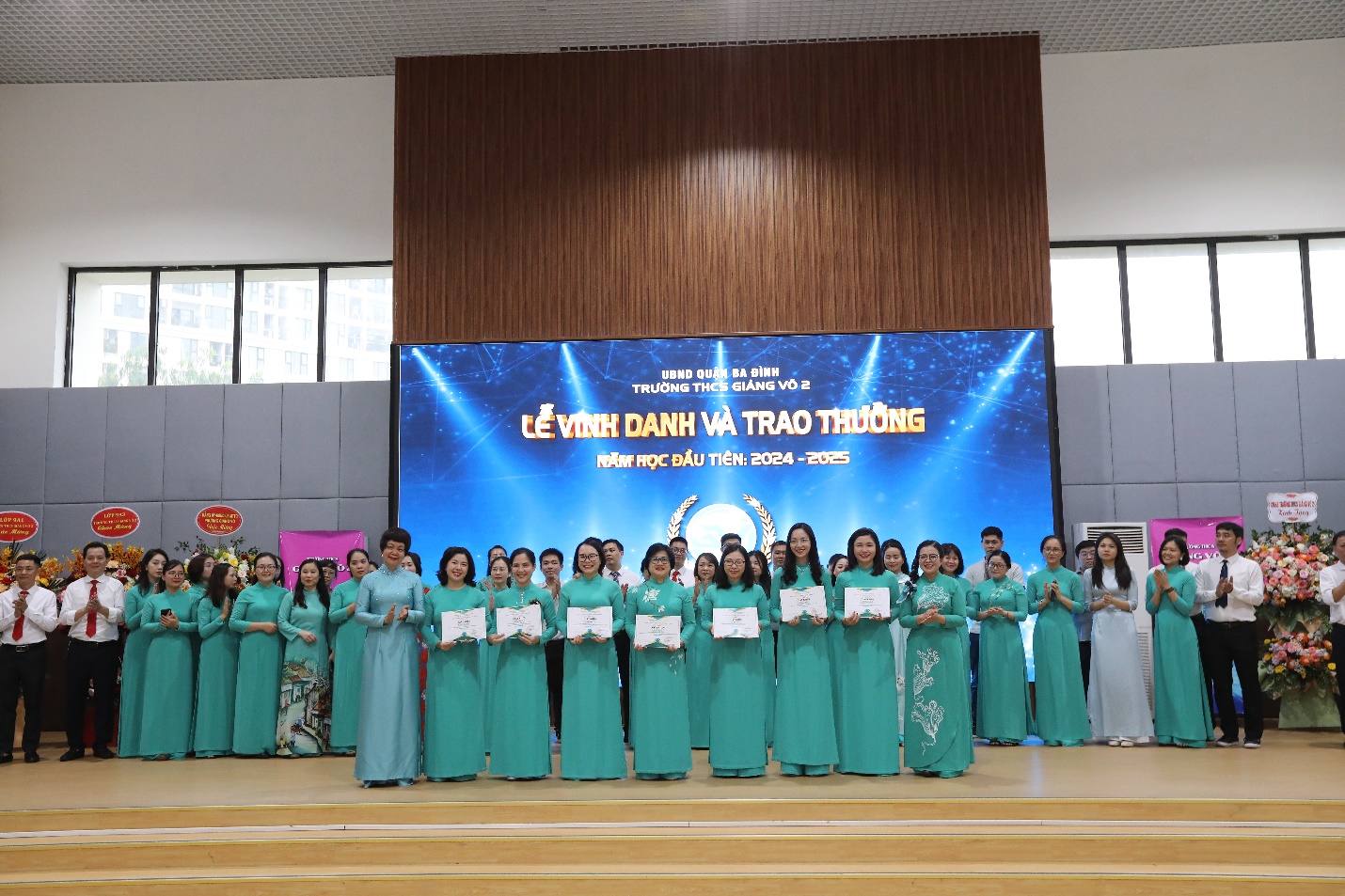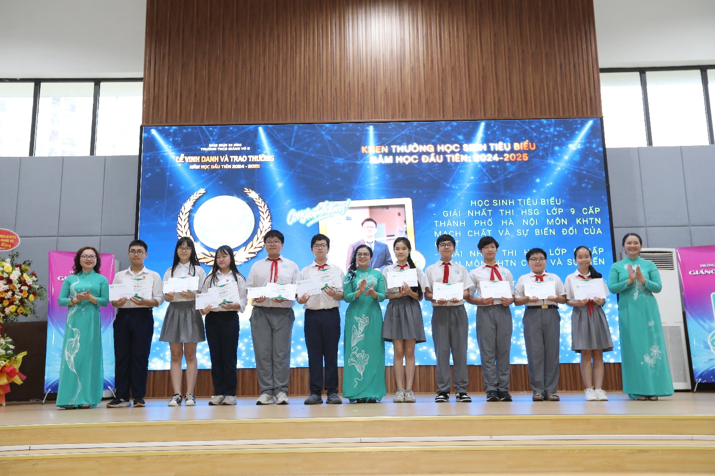 Ngay sau đó, clip tổng kết năm học – 10 dấu ấn của năm học đầu tiên – đã đưa mọi người nhìn lại hành trình nỗ lực không ngừng của thầy và trò Giảng Võ 2. Trong năm học khai mở, nhà trường đã tham gia hơn 50 cuộc thi với gần 400 học sinh được vinh danh, mang về 1022 giải thưởng các cấp, từ cấp Quận, Thành phố, cấp Quốc gia và Quốc tế. Chia sẻ tại buổi lễ, cô giáo Phạm Thị Hương Giang – Bí thư Chi bộ, Hiệu trưởng nhà trường – xúc động nói: Vượt ngàn chông gai, Giảng Võ 2 đã cán đích năm học đầu tiên với những thành tích vô cùng rực rỡ.