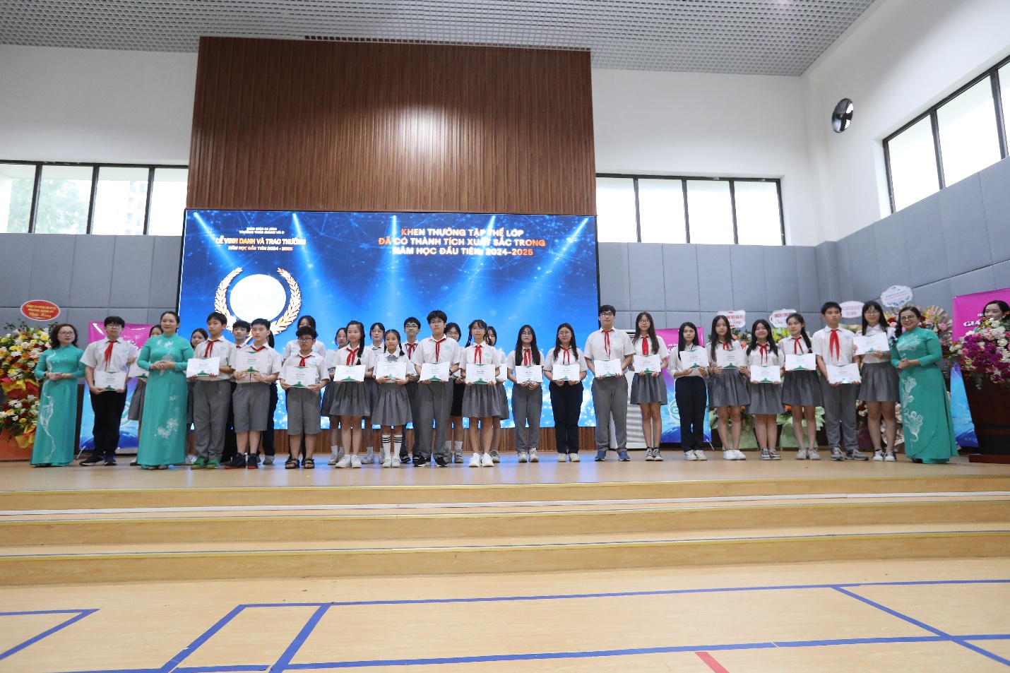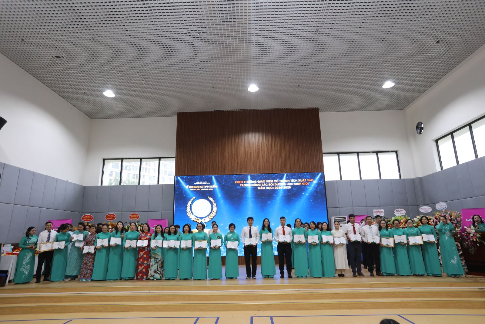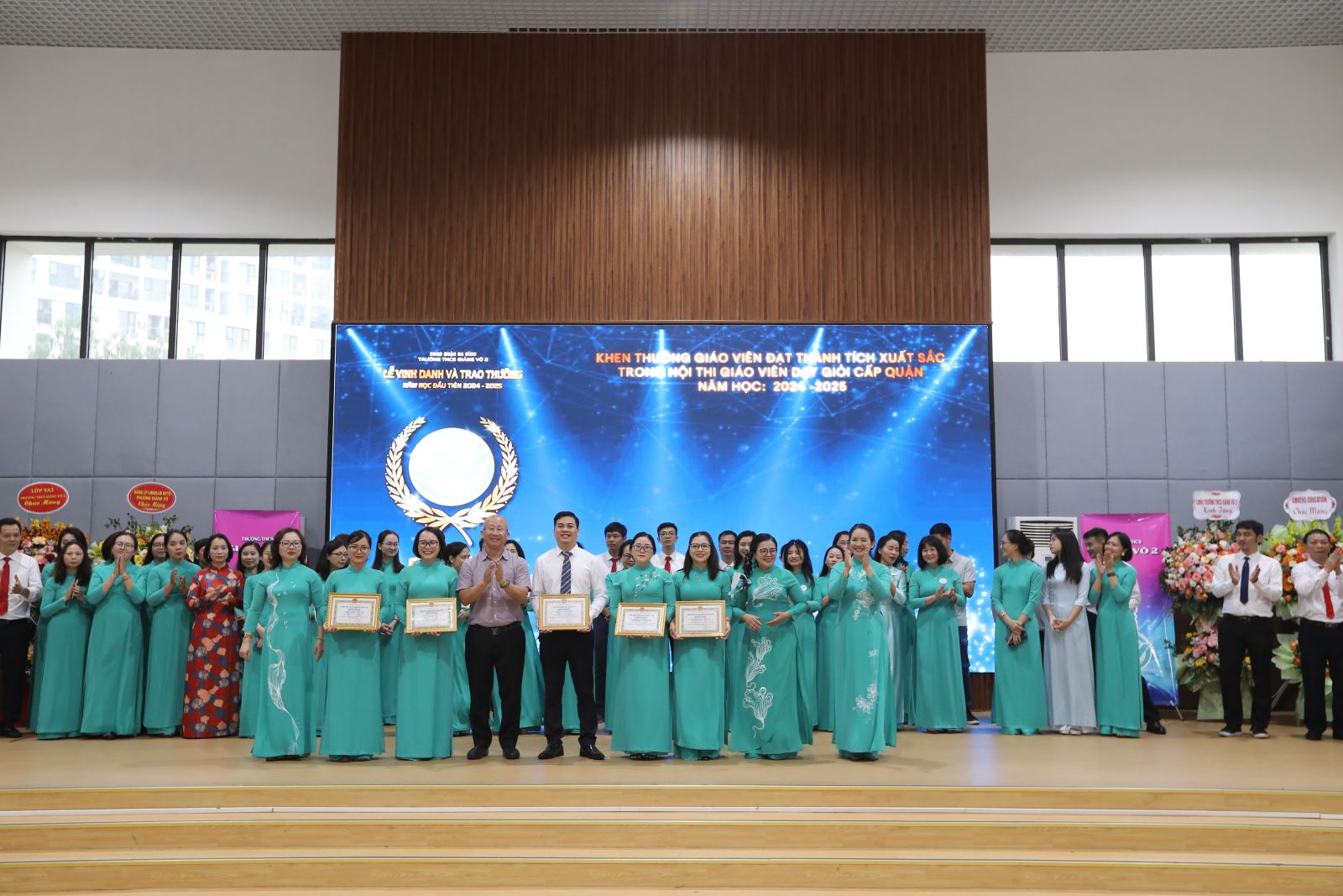 Phần khen thưởng trang trọng tiếp nối là một trong những điểm nhấn ý nghĩa nhất của buổi lễ. Học sinh xuất sắc, các tập thể lớp tiêu biểu, các em đạt thành tích tại các kỳ thi học sinh giỏi các cấp, giáo viên giỏi, tổ chuyên môn xuất sắc… đều lần lượt được xướng tên và tôn vinh. Mỗi giải thưởng là một thành quả đáng tự hào, đồng thời là động lực để thầy trò tiếp tục nỗ lực trong những năm học tiếp theo.