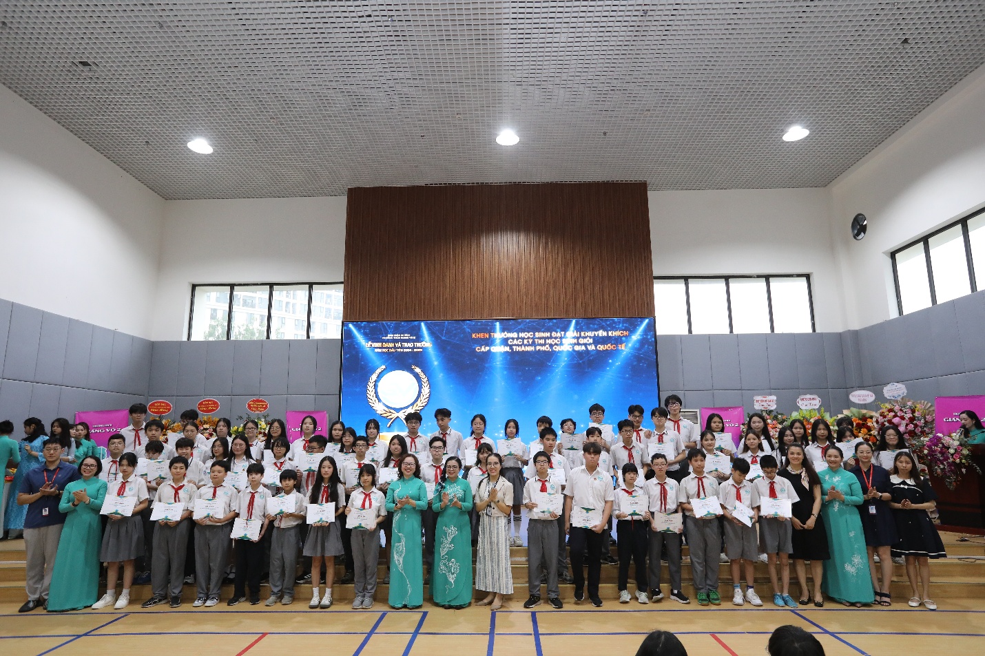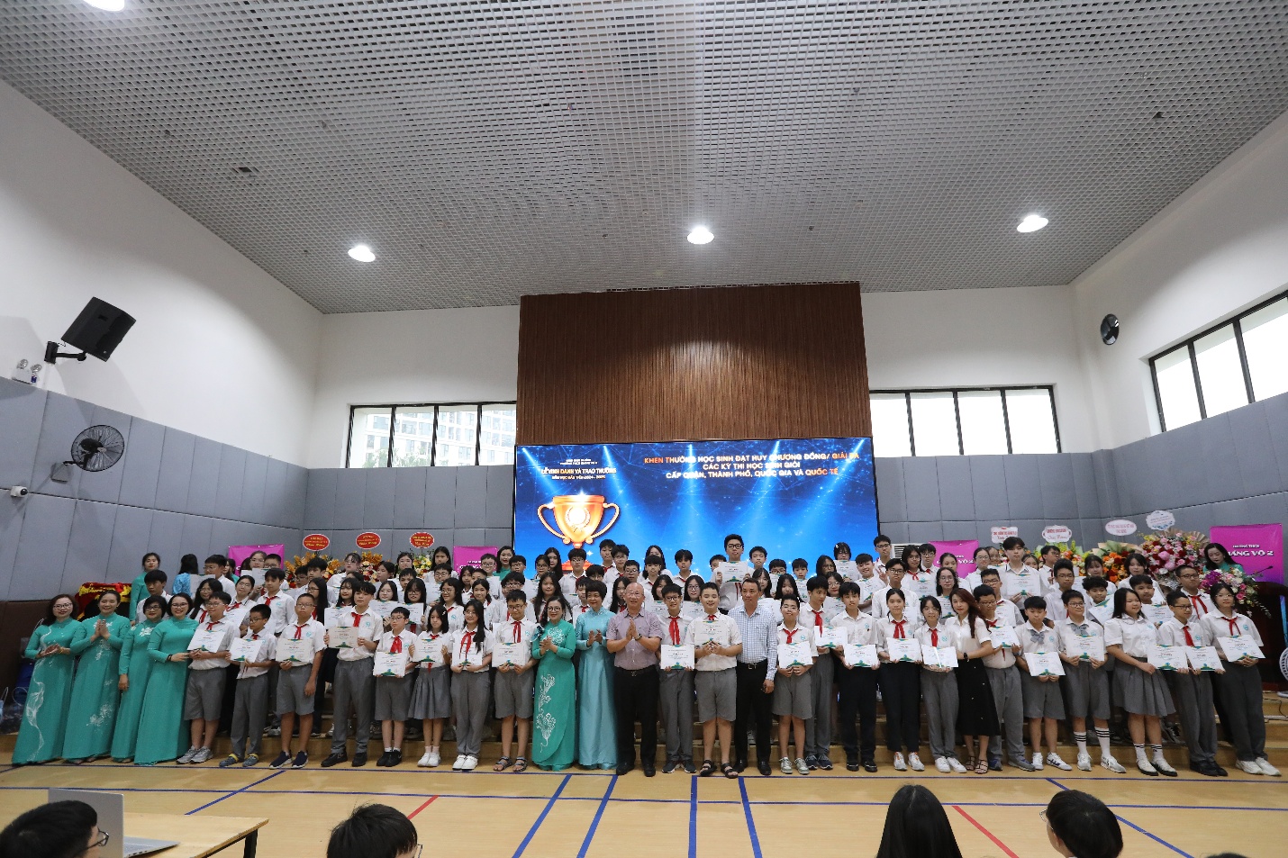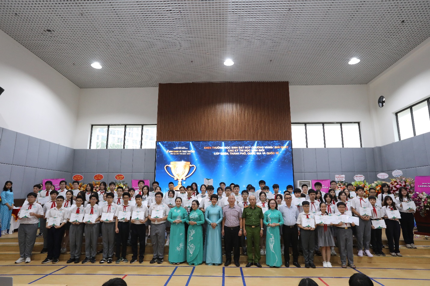 Phần khen thưởng trang trọng tiếp nối là một trong những điểm nhấn ý nghĩa nhất của buổi lễ. Học sinh xuất sắc, các tập thể lớp tiêu biểu, các em đạt thành tích tại các kỳ thi học sinh giỏi các cấp, giáo viên giỏi, tổ chuyên môn xuất sắc… đều lần lượt được xướng tên và tôn vinh. Mỗi giải thưởng là một thành quả đáng tự hào, đồng thời là động lực để thầy trò tiếp tục nỗ lực trong những năm học tiếp theo.