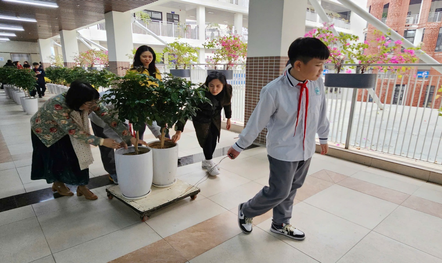 Học sinh, phụ huynh và giáo viên chuyển cây xanh về các lớp