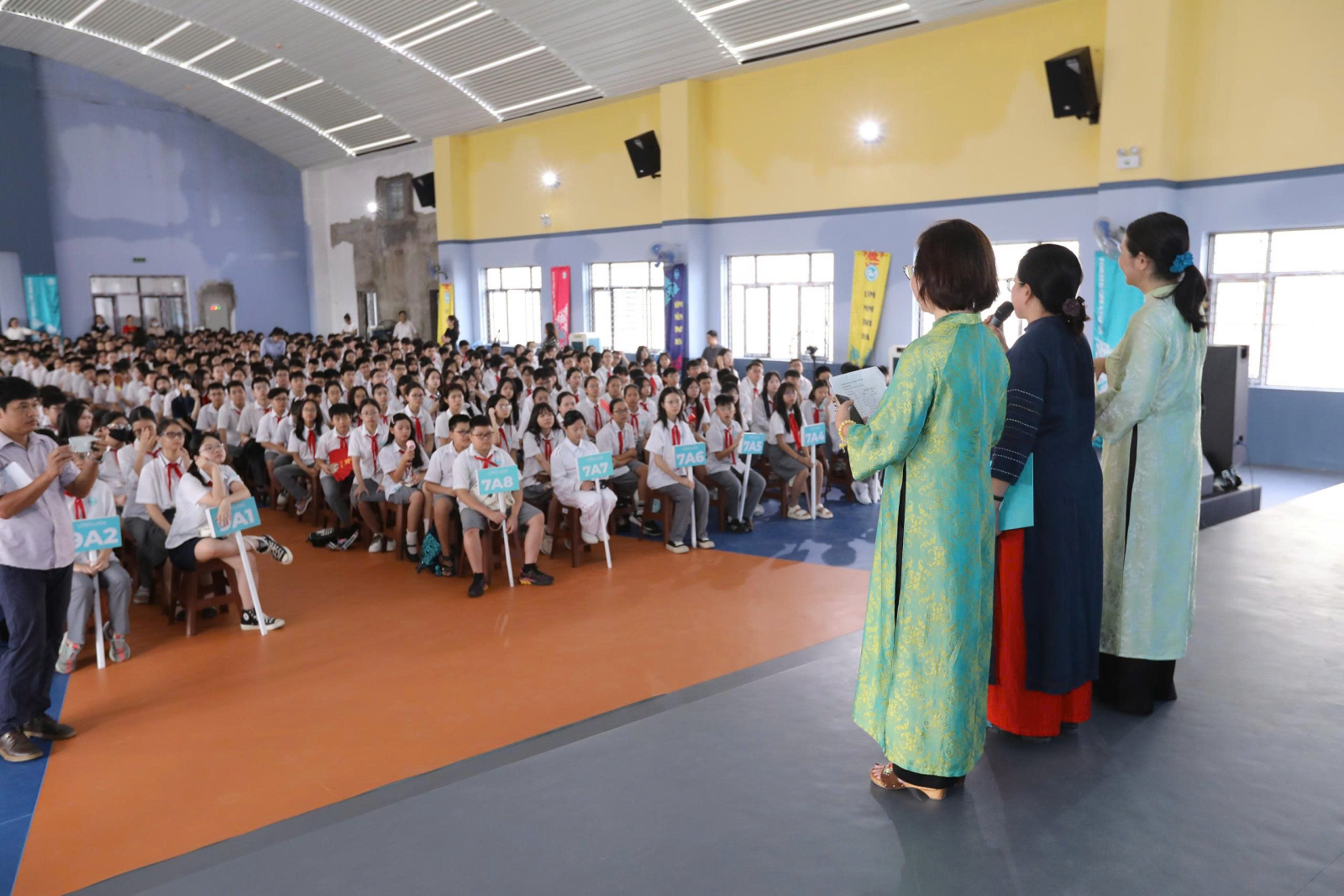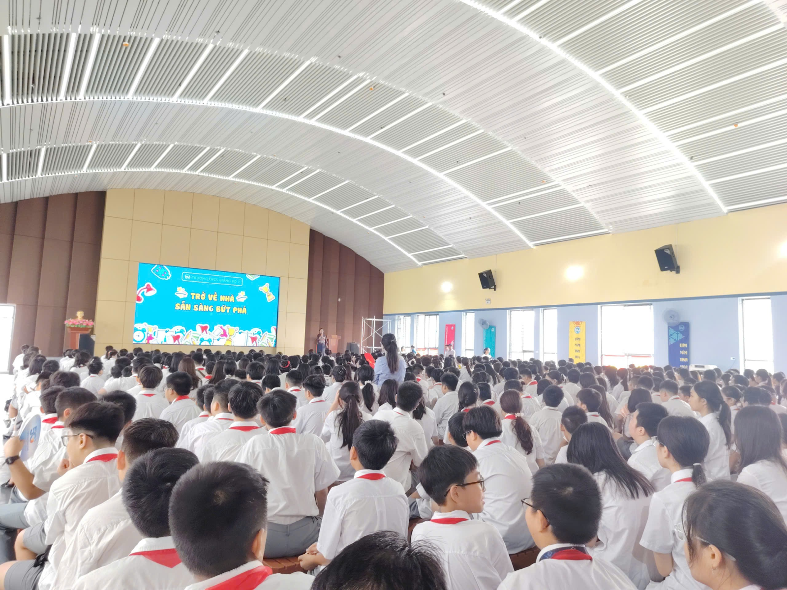 Học sinh khối 7,8,9 tập trung ở nhà Đa năng mới của trường