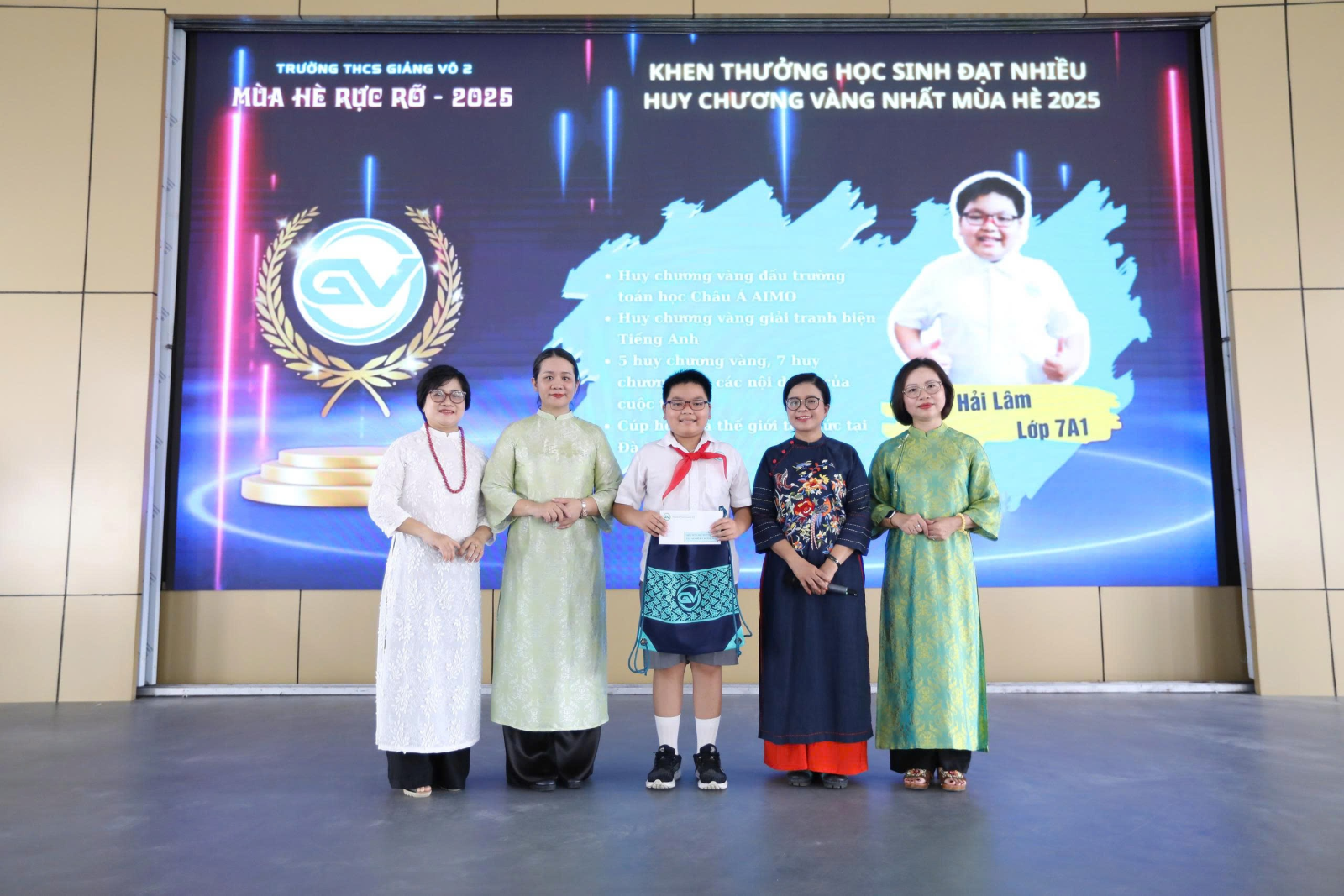Ban Giám hiệu tuyên dương bạn Tô Hải Lâm lớp 7A1 đạt nhiều huy chương vàng nhất mùa hè 2025