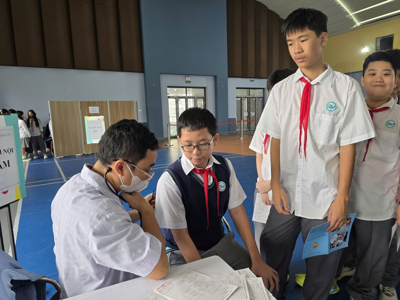 Học sinh Trường THCS Giảng Võ 2 hào hứng tham gia khám sức khỏe định kỳ.