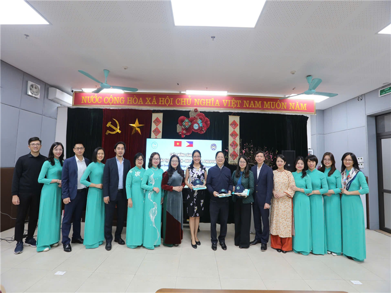 GS.TS. Gladys Nivera, Hiệu trưởng Trường Đào tạo Giáo viên, Đại học Sư phạm Manila- Philippines (đứng giữa) chụp ảnh lưu niệm cùng các đại biểu, Ban Giám hiệu và các thầy cô tổ Tự nhiên 1 trường THCS Giảng Võ 2