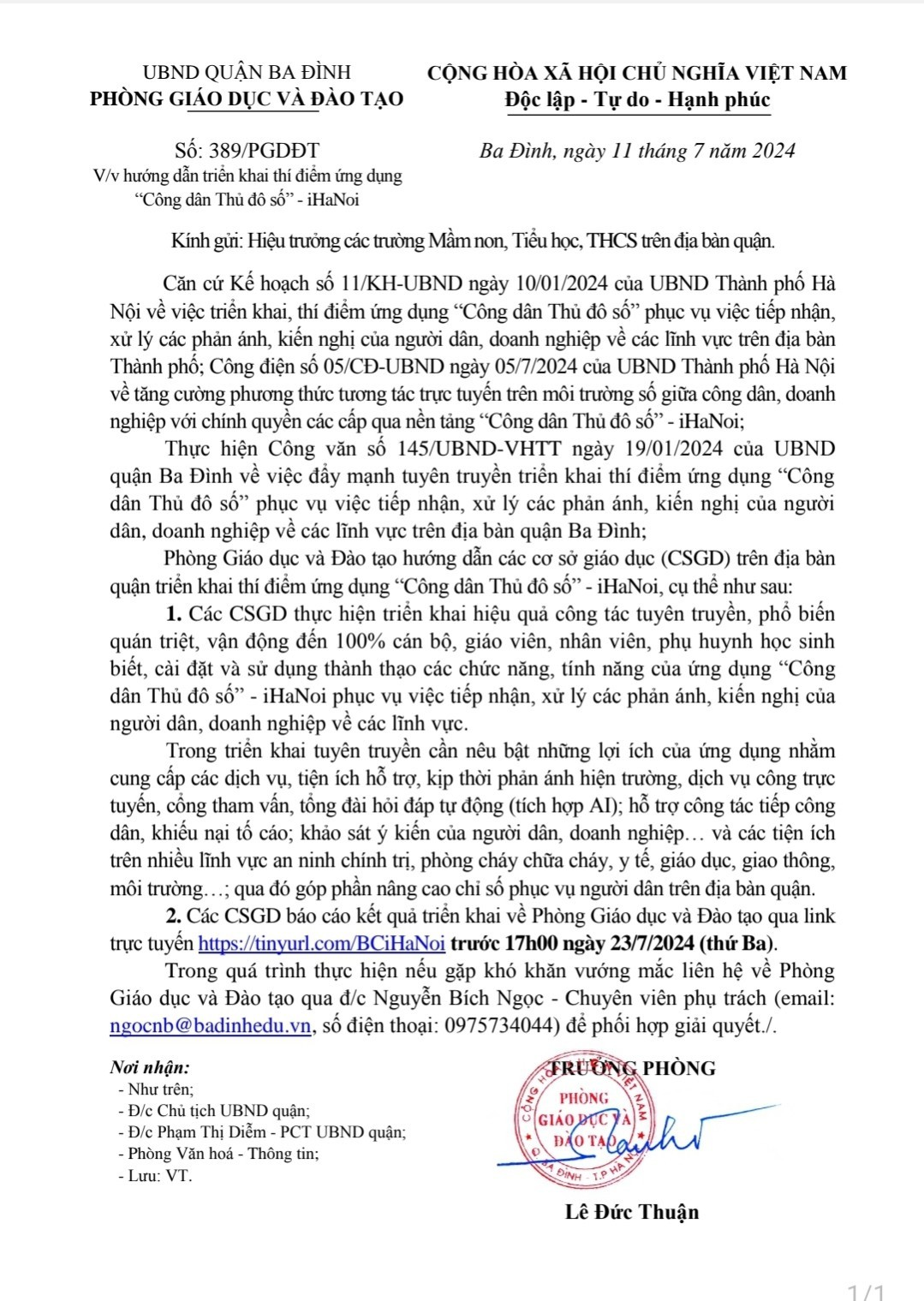 Công văn chỉ đạo của Phòng GD&ĐT quận Ba Đình
