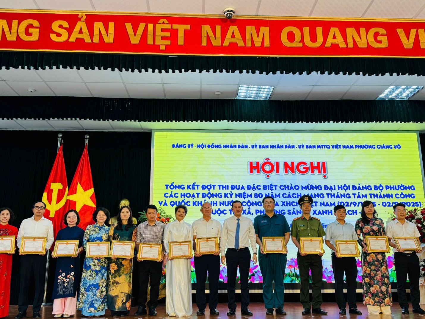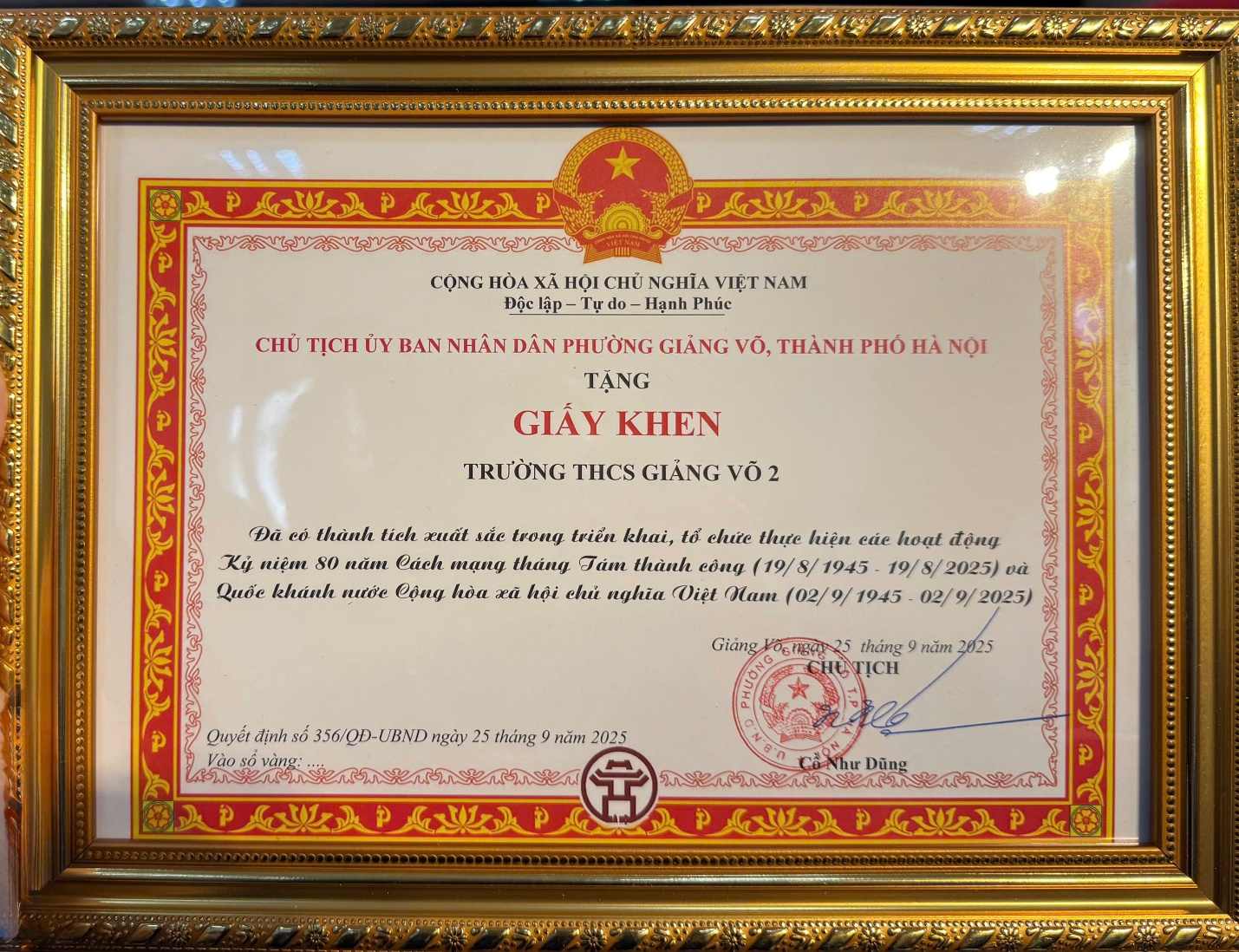 Sáng nay, 26/9/2025, tại Hội nghị tổng kết đợt thi đua đặc biệt chào mừng Đại hội Đảng bộ phường; các hoạt động kỷ niệm 80 năm Cách mạng Tháng Tám thành công, Quốc khánh nước CHXHCN Việt Nam (02/9/1945 – 02/9/2025) và cuộc thi “Xã, phường Sáng – Xanh – Sạch – Đẹp”, trường THCS Giảng Võ 2 vinh dự được Chủ tịch UBND phường trao Giấy khen vì đã có thành tích xuất sắc trong triển khai, tổ chức các hoạt động kỷ niệm.