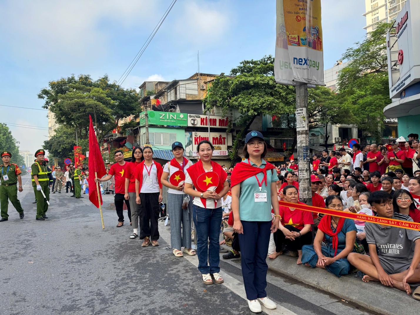 Cán bộ, giáo viên trường THCS Giảng Võ 2 tham gia hỗ trợ lực lượng an ninh và nhân dân trong Lễ diễu binh, diễu hành kỷ niệm 80 năm Cách mạng Tháng Tám thành công và Quốc khánh 2/9.