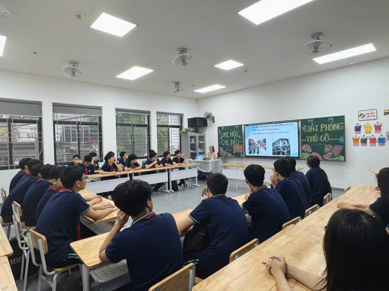 Trong tiết học, cô Vũ Thị Thu Trang đã giúp học sinh 9A4 hiểu rõ hơn về ý nghĩa lịch sử của ngày 10/10 – ngày đoàn quân chiến thắng tiến về Hà Nội, mang theo lá cờ đỏ sao vàng tung bay trên bầu trời hòa bình.
