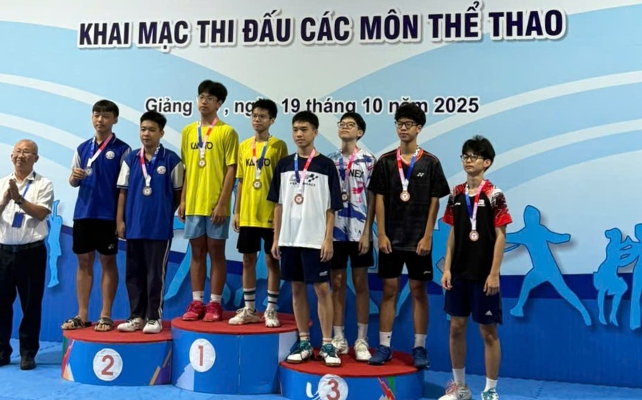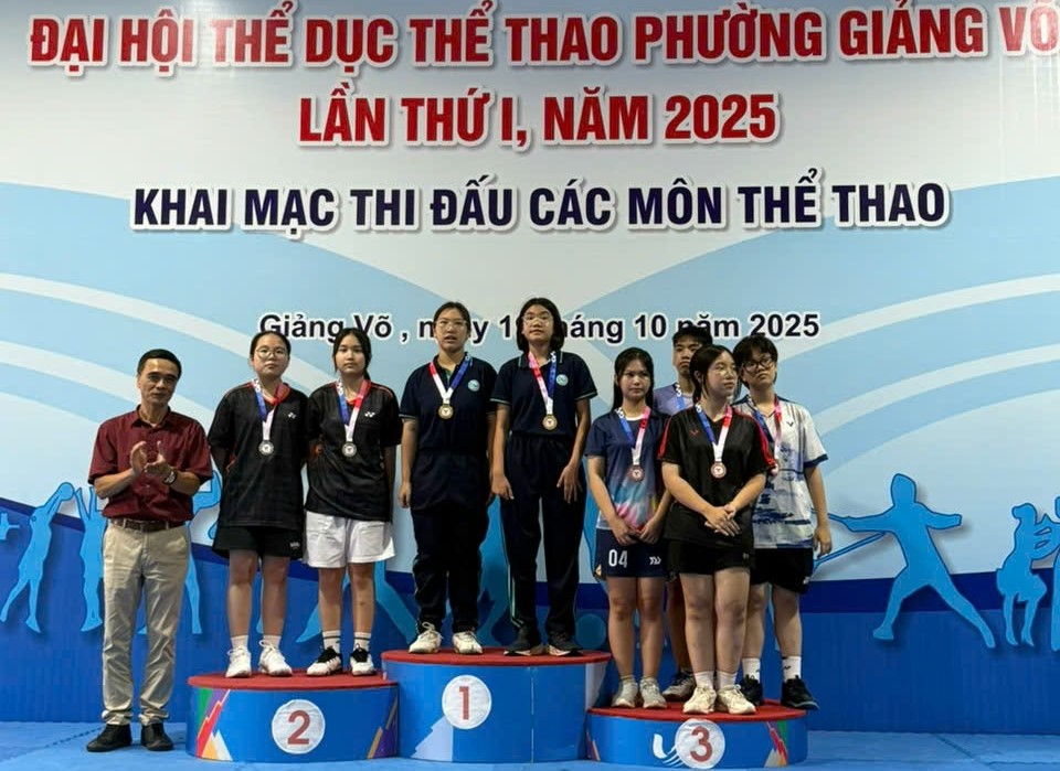 Sau những trận cầu kịch tính và sôi nổi, học sinh THCS Giảng Võ 2 đã mang về nhiều thành tích xuất sắc. Trong đó, Vũ Minh Đức (7A8) giành Huy chương Vàng nội dung đơn nam lứa tuổi 12–13; cặp đôi Trịnh Cẩm Linh (8A4) và Lê Khánh Hà Linh (9A5) xuất sắc đoạt Huy chương Vàng đôi nữ lứa tuổi 14–15; còn Đỗ Minh Hải (8A3) cùng Phùng Ngọc Thái Dương (8A5) cũng ghi dấu ấn với Huy chương Đồng đôi nam lứa tuổi 14–15. Những tấm huy chương rực rỡ ấy không chỉ là minh chứng cho tài năng và nỗ lực của các em, mà còn khẳng định sự phát triển mạnh mẽ của phong trào thể thao trong nhà trường.