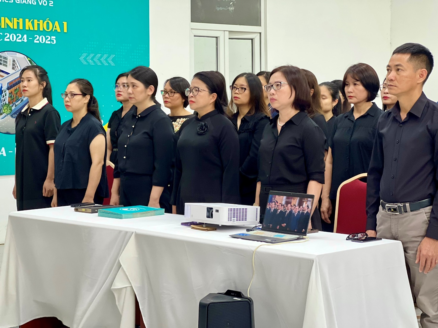 Ngày 26/7/2024, nhân dân cả nước tiễn biệt Tổng Bí thư Nguyễn Phú Trọng về nơi an nghỉ vĩnh hằng, toàn thể cán bộ, giáo viên, nhân viên của trường THCS Giảng Võ 2 đã thành kính, xúc động tham dự lễ tưởng niệm Tổng Bí thư tại phòng Hội đồng nhà trường.