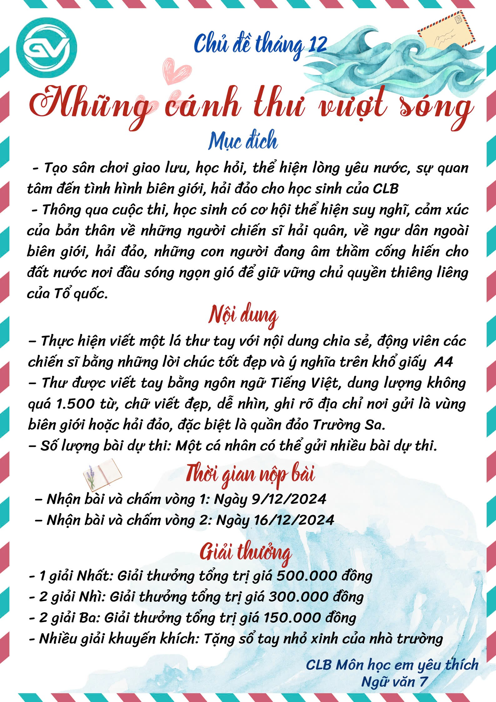 Hoạt động ý nghĩa của Câu lạc bộ “Môn học em yêu thích Ngữ văn 7” Chủ đề tháng 12: Những cánh thư vượt sóng 21/12/2024 Chi tiết